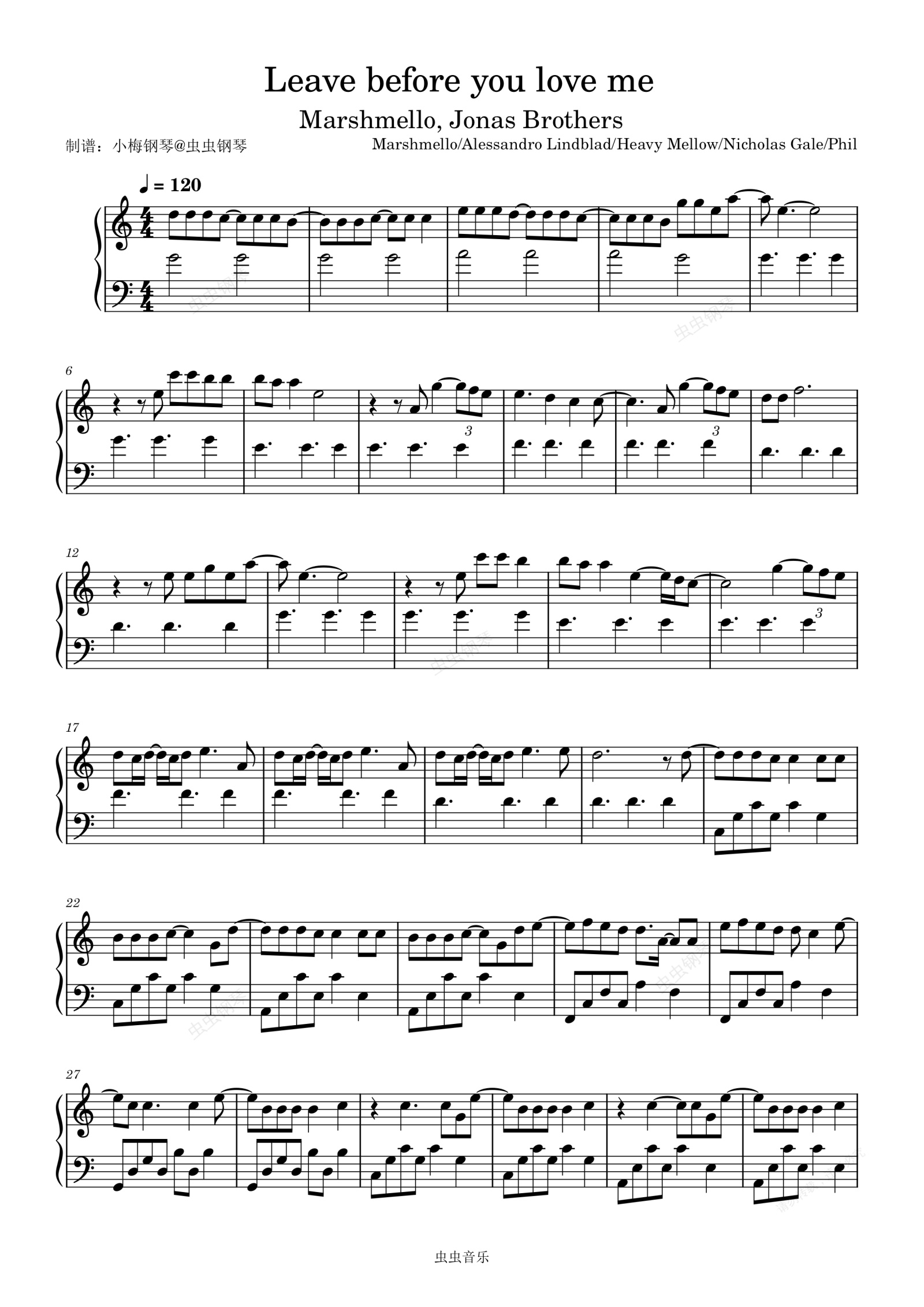 钢琴谱:Leave Before You Love Me - Marshmello (棉花糖)/Jonas Brothers (乔纳斯兄弟)
