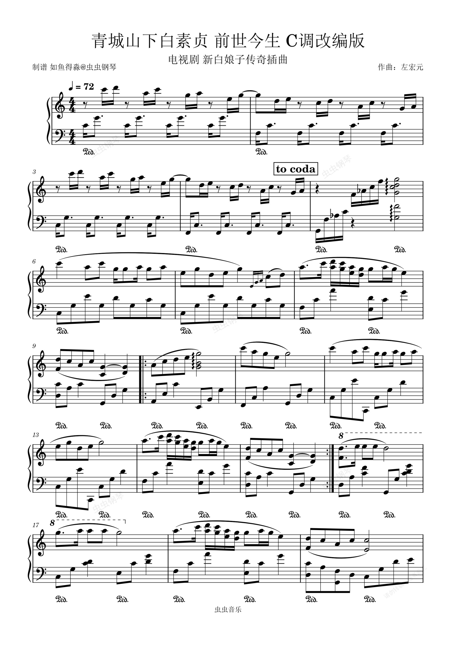 钢琴谱:青城山下白素贞 前世今生 C调改编版