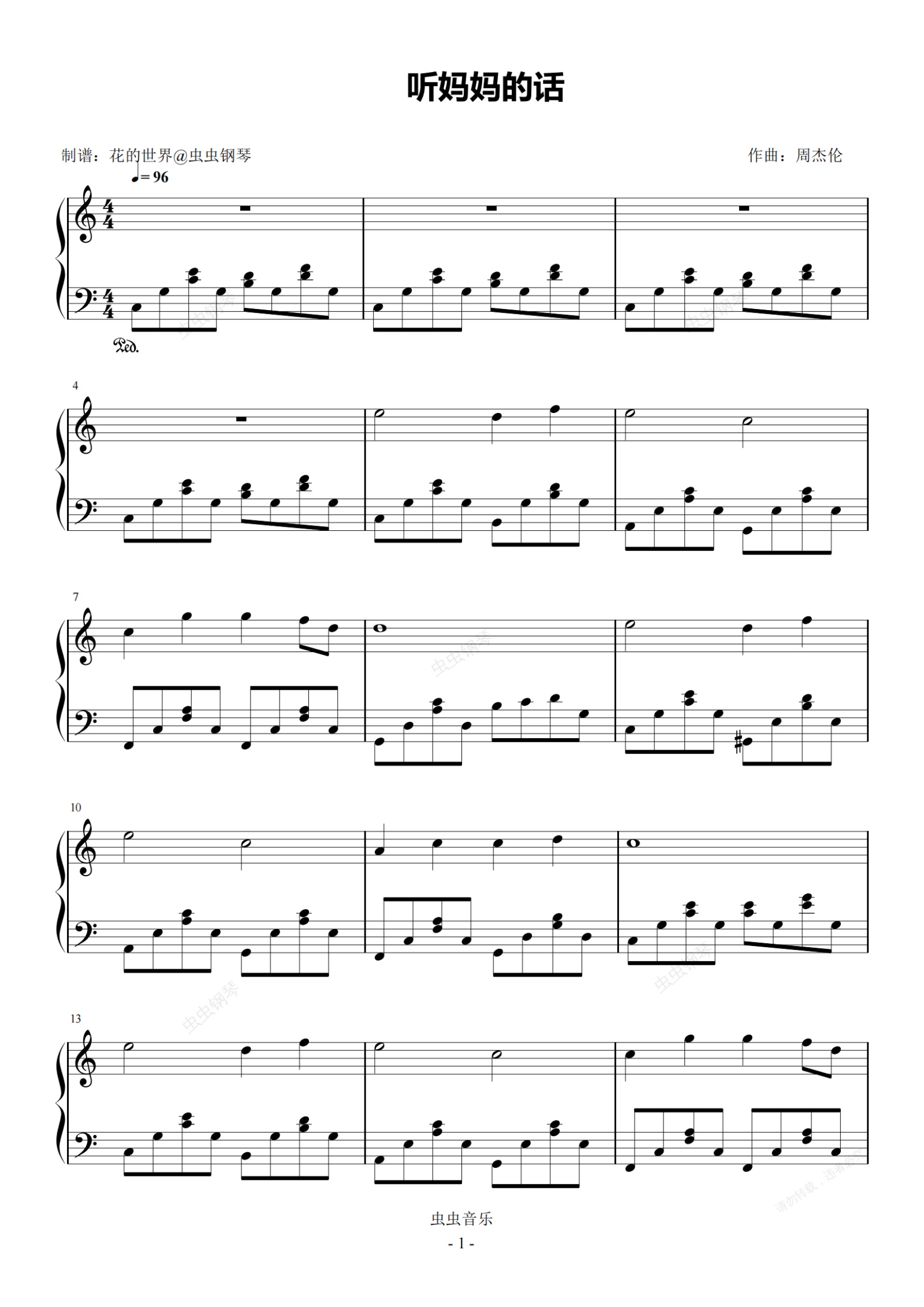 钢琴谱:挖呀挖呀挖 听妈妈的话 C调简易版 周杰伦