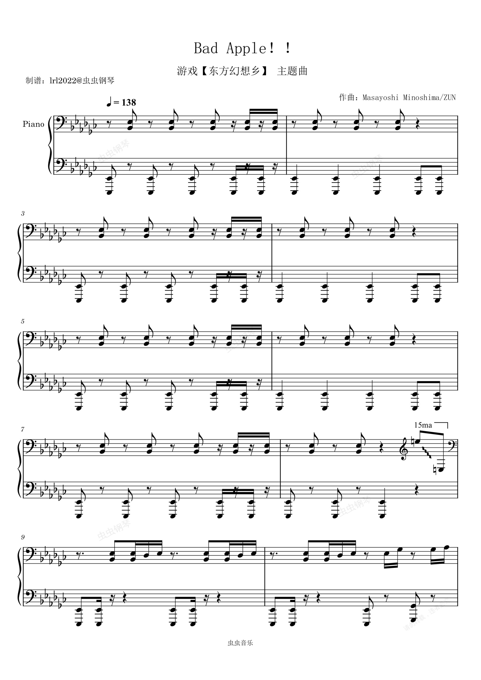 钢琴谱:Bad Apple!! - 游戏【东方幻想乡】主题曲 - 钢琴独奏 - Lotus Land Story