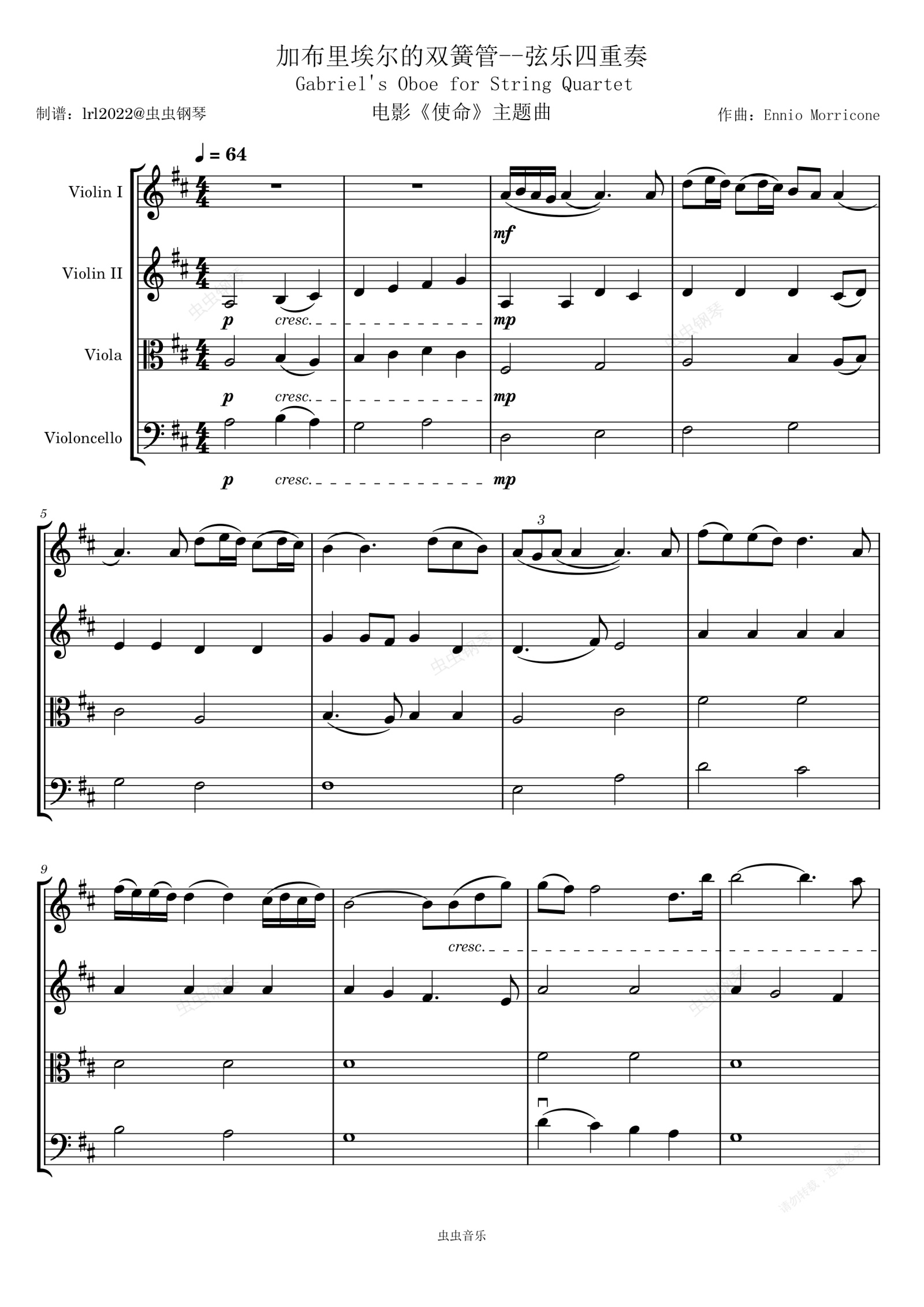 钢琴谱:Gabriel's Oboe for String Quartet - 弦乐四重奏 - 《加布里埃尔的双簧管》-电影《使命》主题曲