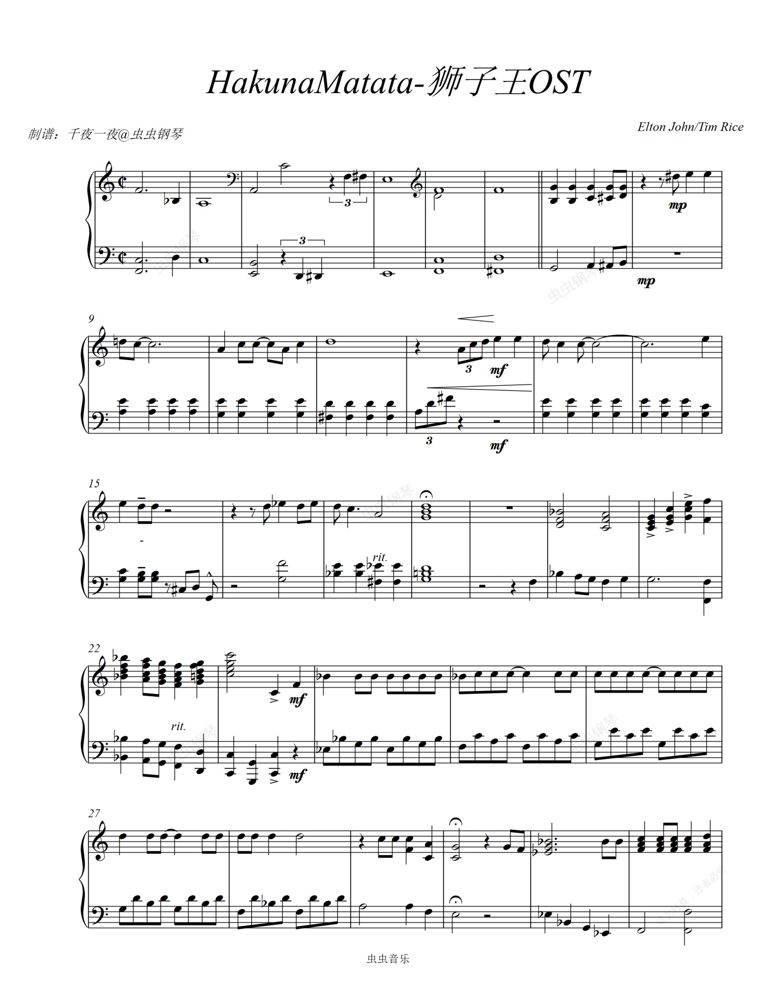 钢琴谱:迪士尼 《狮子王 1》Hakuna Matata 重温经典电影歌曲 无忧无虑