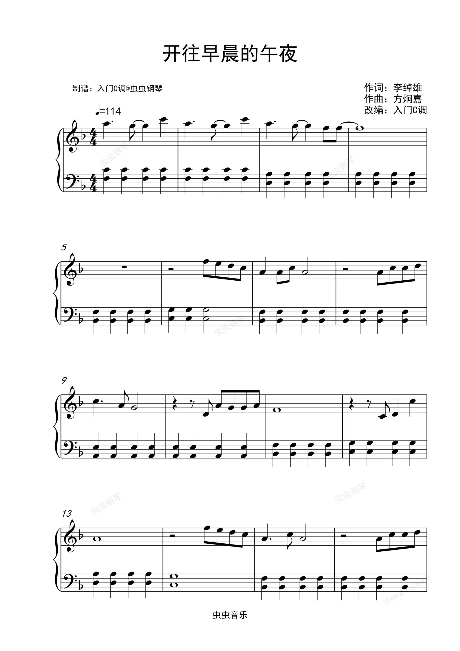 钢琴谱:张碧晨《开往早晨的午夜》入门原调简单版