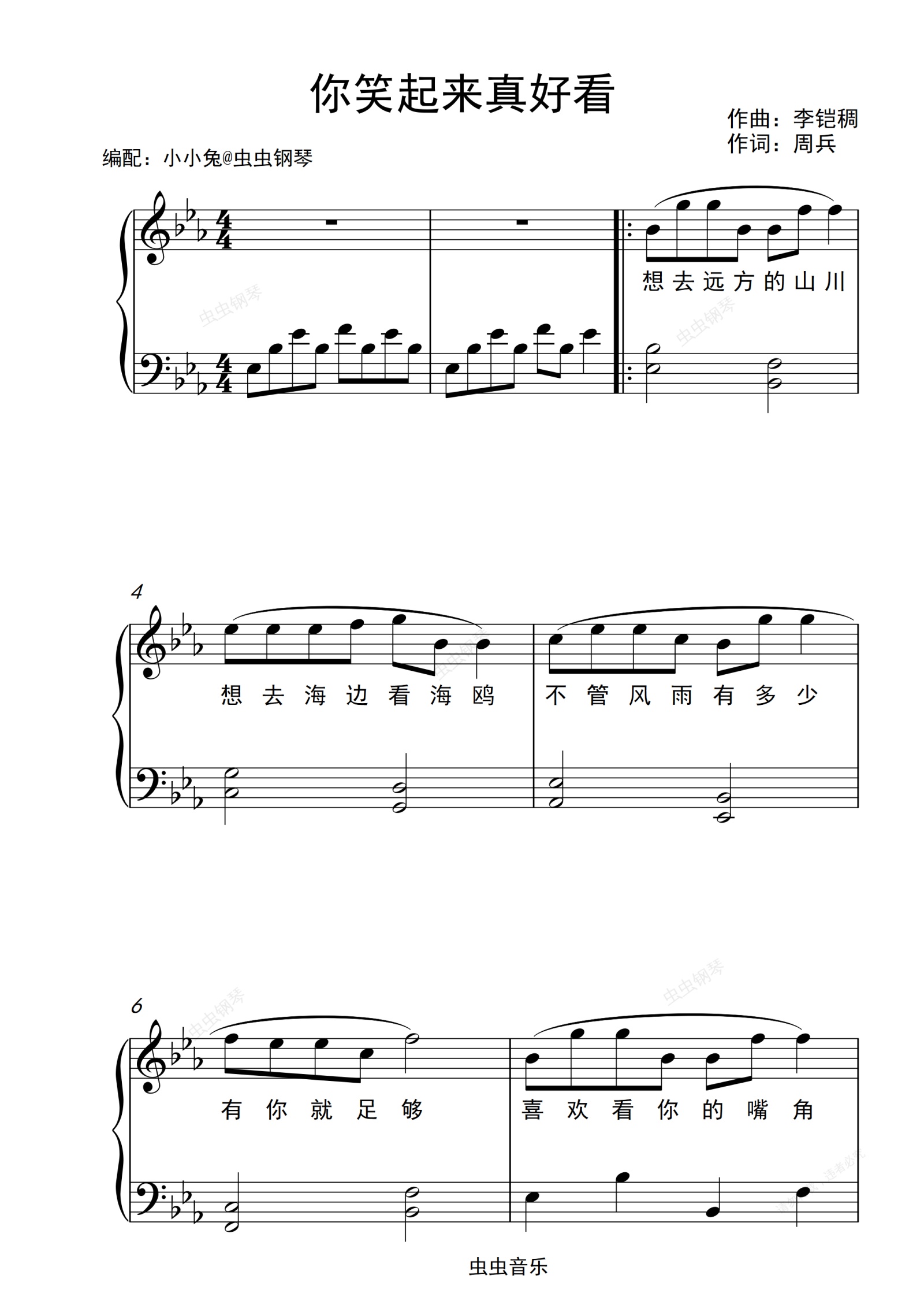 钢琴谱:你笑起来真好看 原调 简易