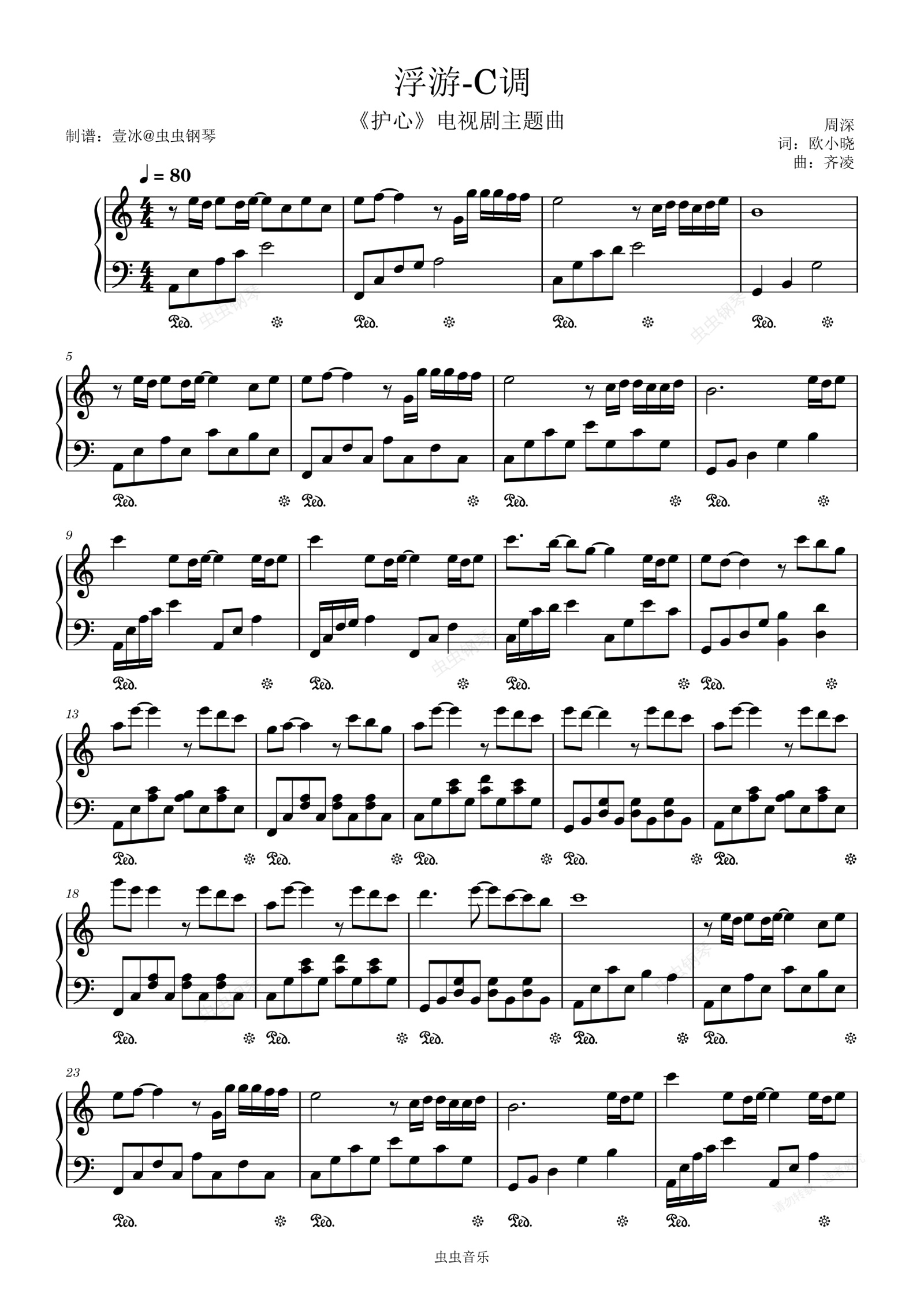 钢琴谱:浮游 (《护心》电视剧主题曲) - 周深 C调