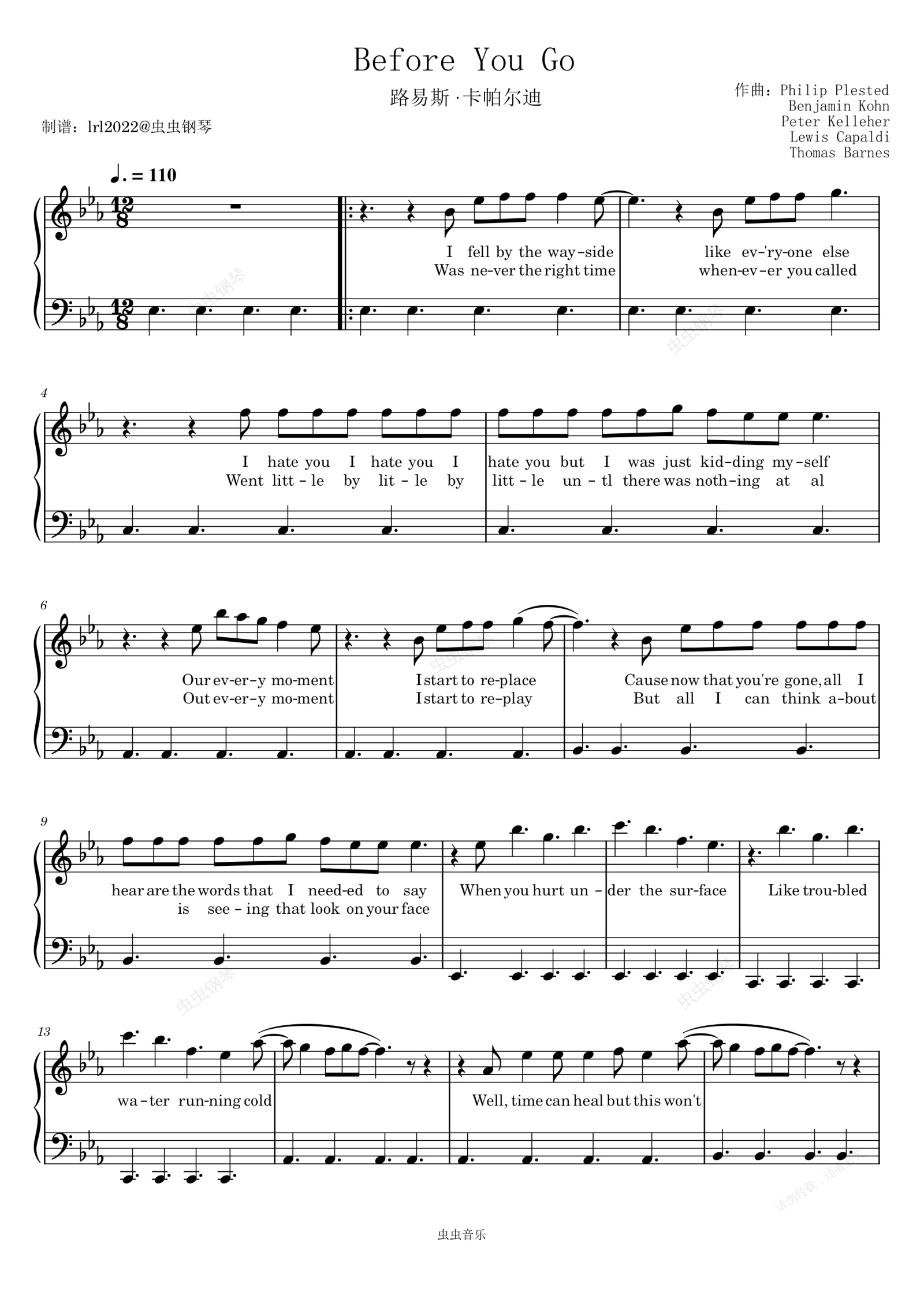 钢琴谱:Before you go - 路易斯·卡帕尔迪 - 歌词版