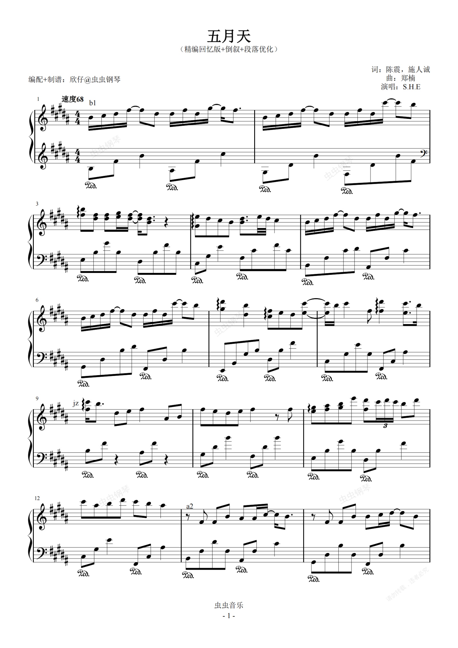 钢琴谱:S.H.E-B《五月天》(精编回忆版+倒叙+段落优化)