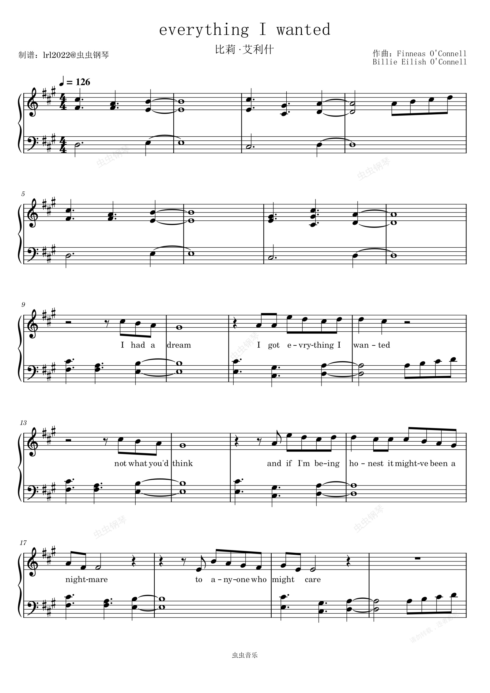 钢琴谱:everything I wanted - billie eilish - 带歌词 - 钢琴独奏