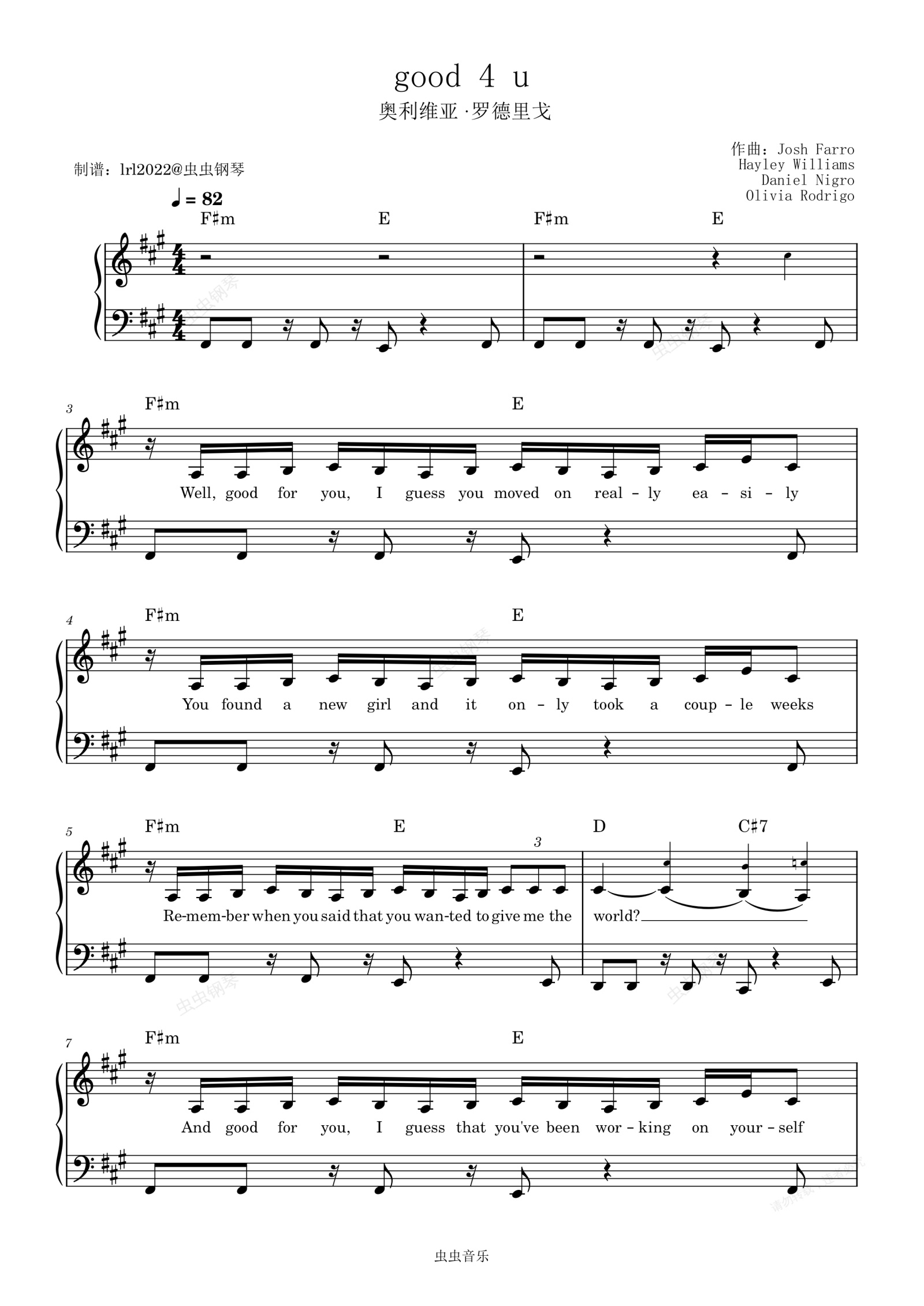 钢琴谱:good 4 u – Olivia Rodrigo - 带歌词和弦 - 钢琴独奏