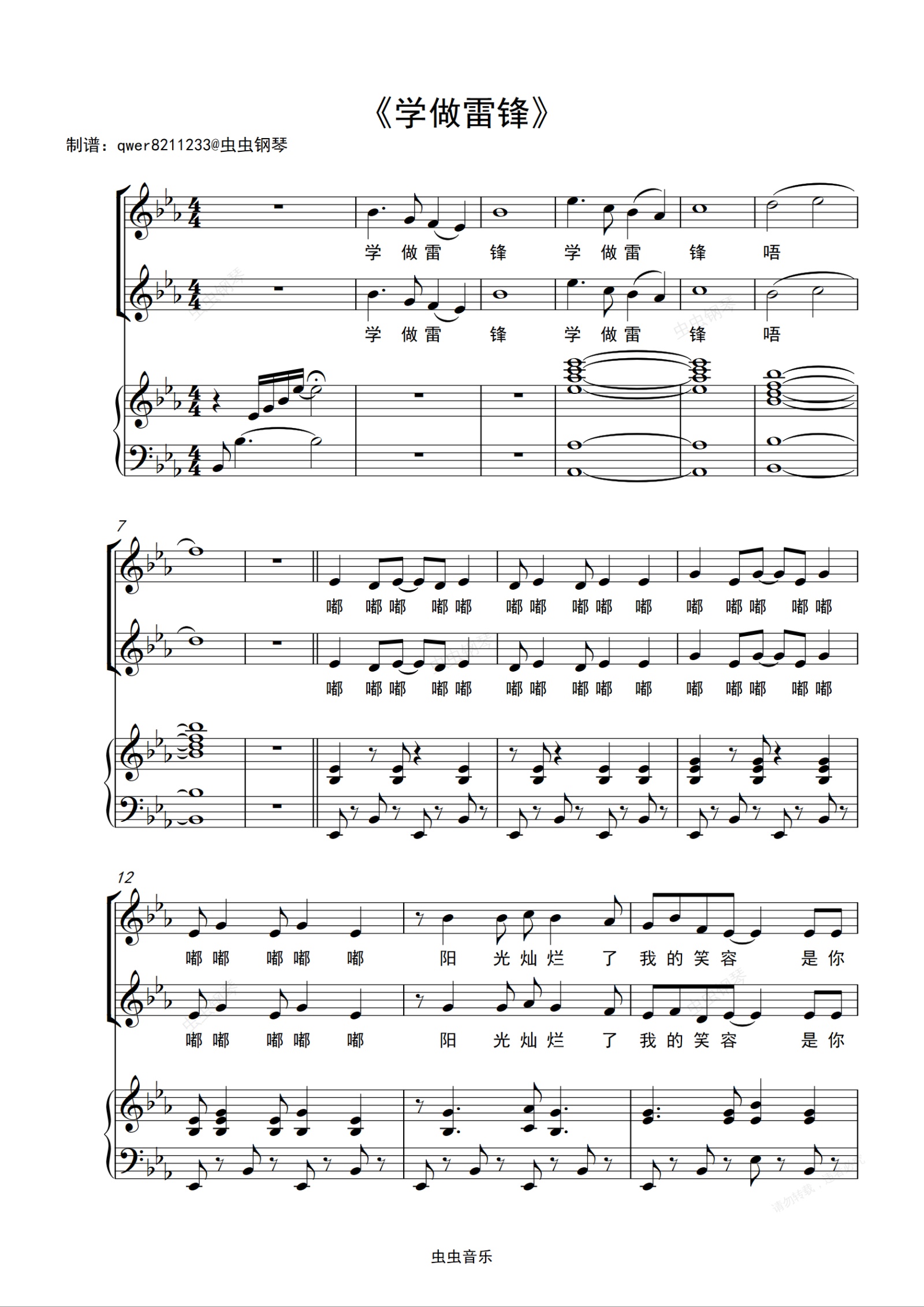 钢琴谱:《学做雷锋》二声部合唱正谱