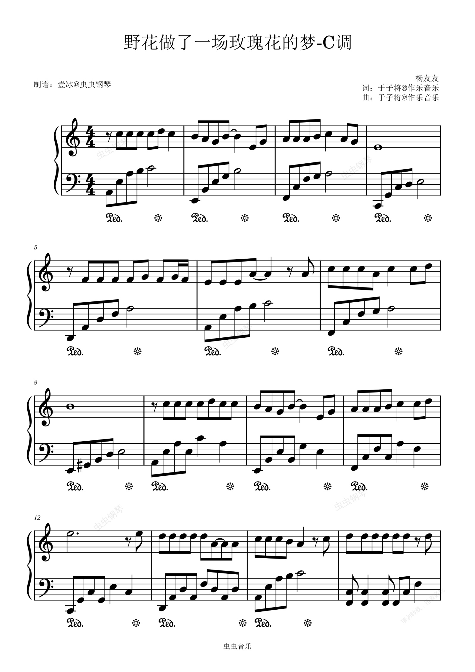 钢琴谱:野花做了场玫瑰花的梦-C调