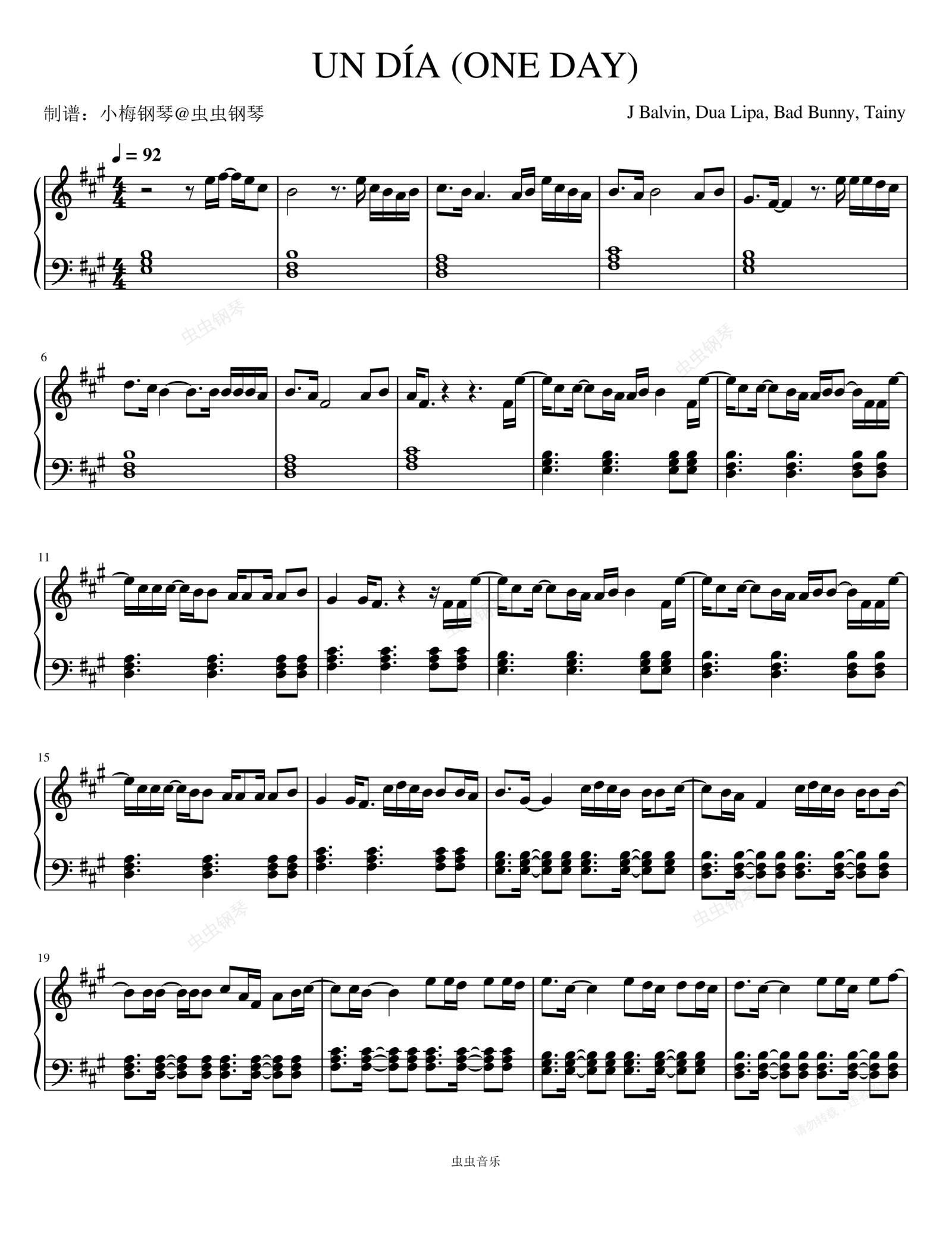 钢琴谱:UN DIA (ONE DAY) - J Balvin (J·巴拉文)/Dua Lipa/Bad Bunny (坏痞兔)/Tainy