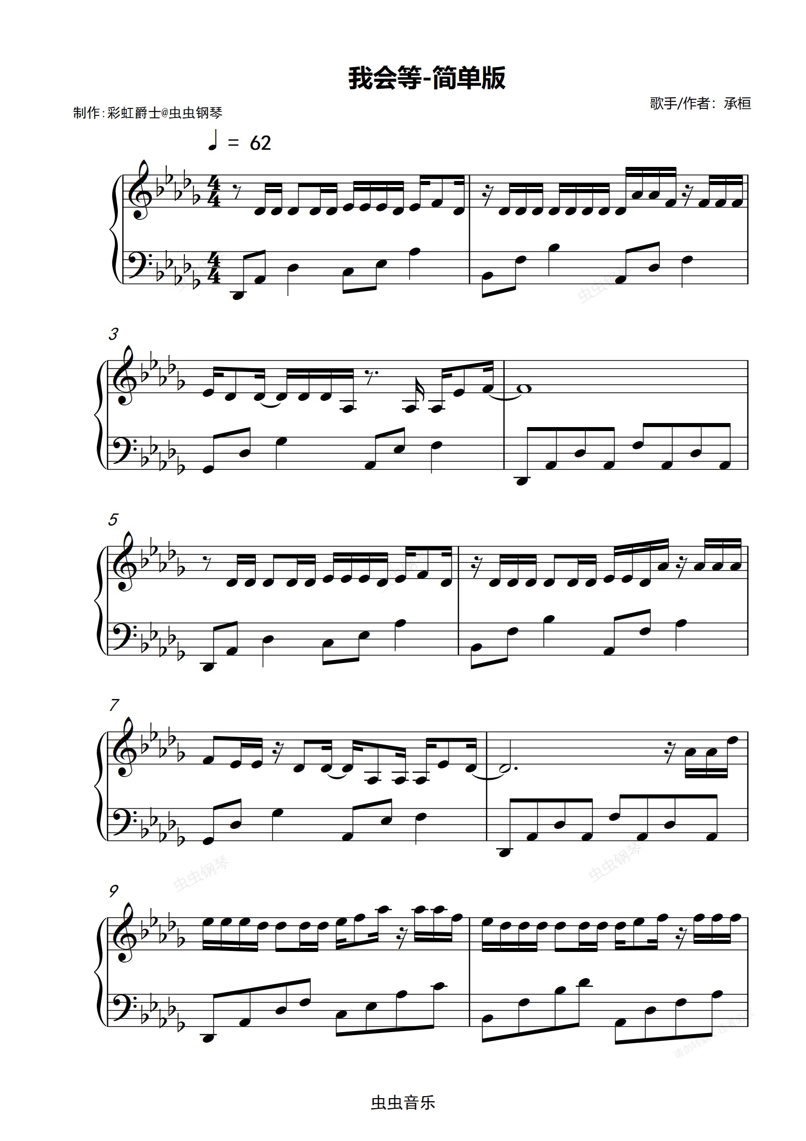 钢琴谱:我会等-简单版 钢琴 完整版 承桓