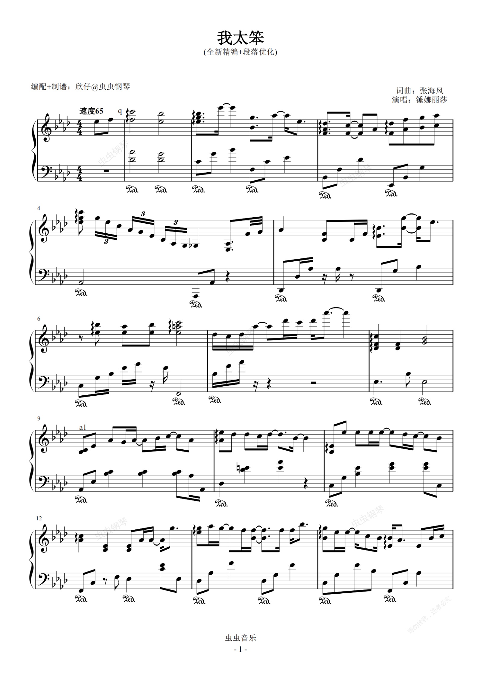 钢琴谱:锤娜丽莎-降A《我太笨》(全新精编+段落优化)