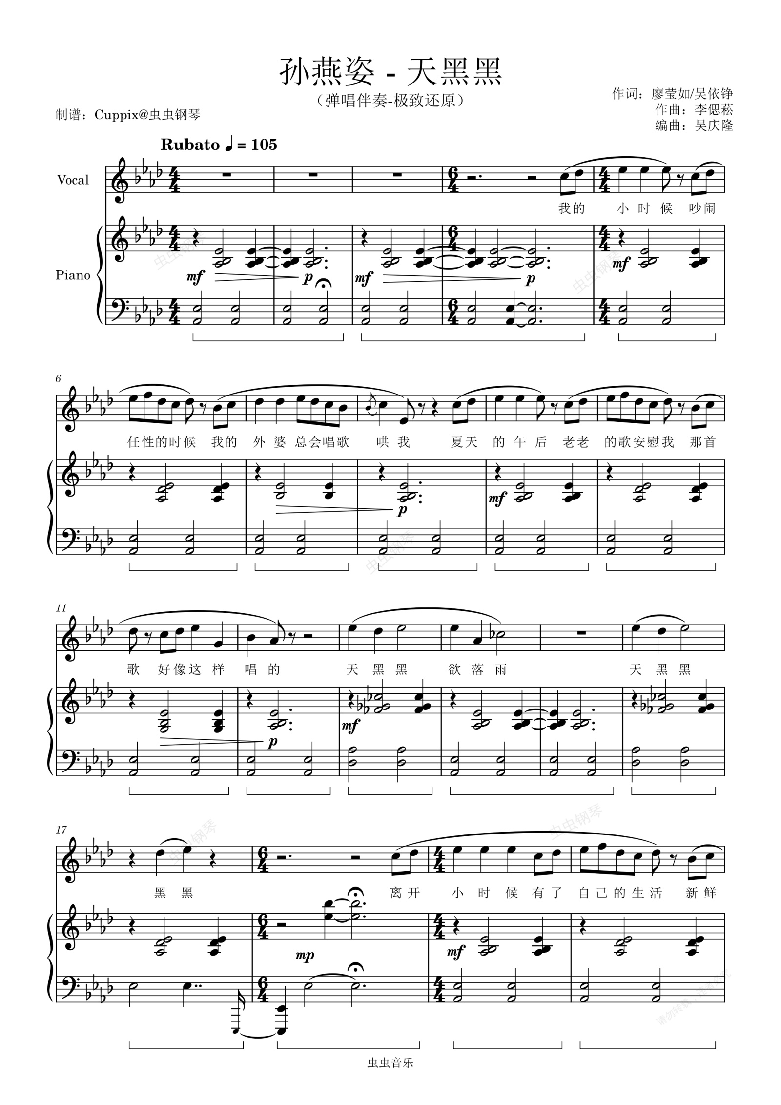 钢琴谱:孙燕姿《天黑黑》弹唱伴奏-极致还原