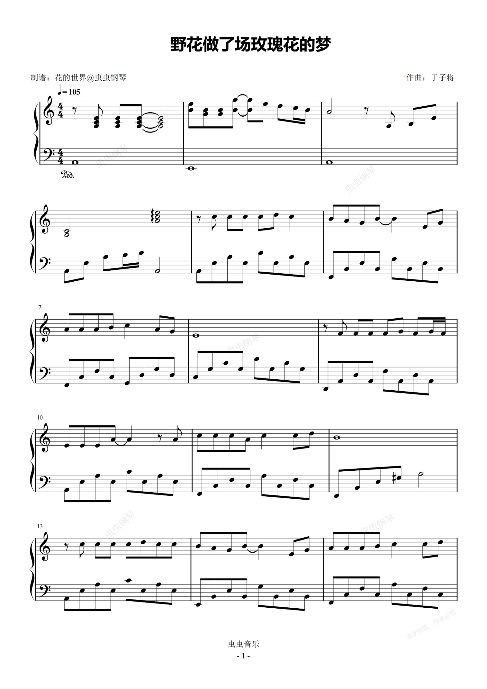 钢琴谱:野花做了场玫瑰花的梦 C调简易版 杨友友