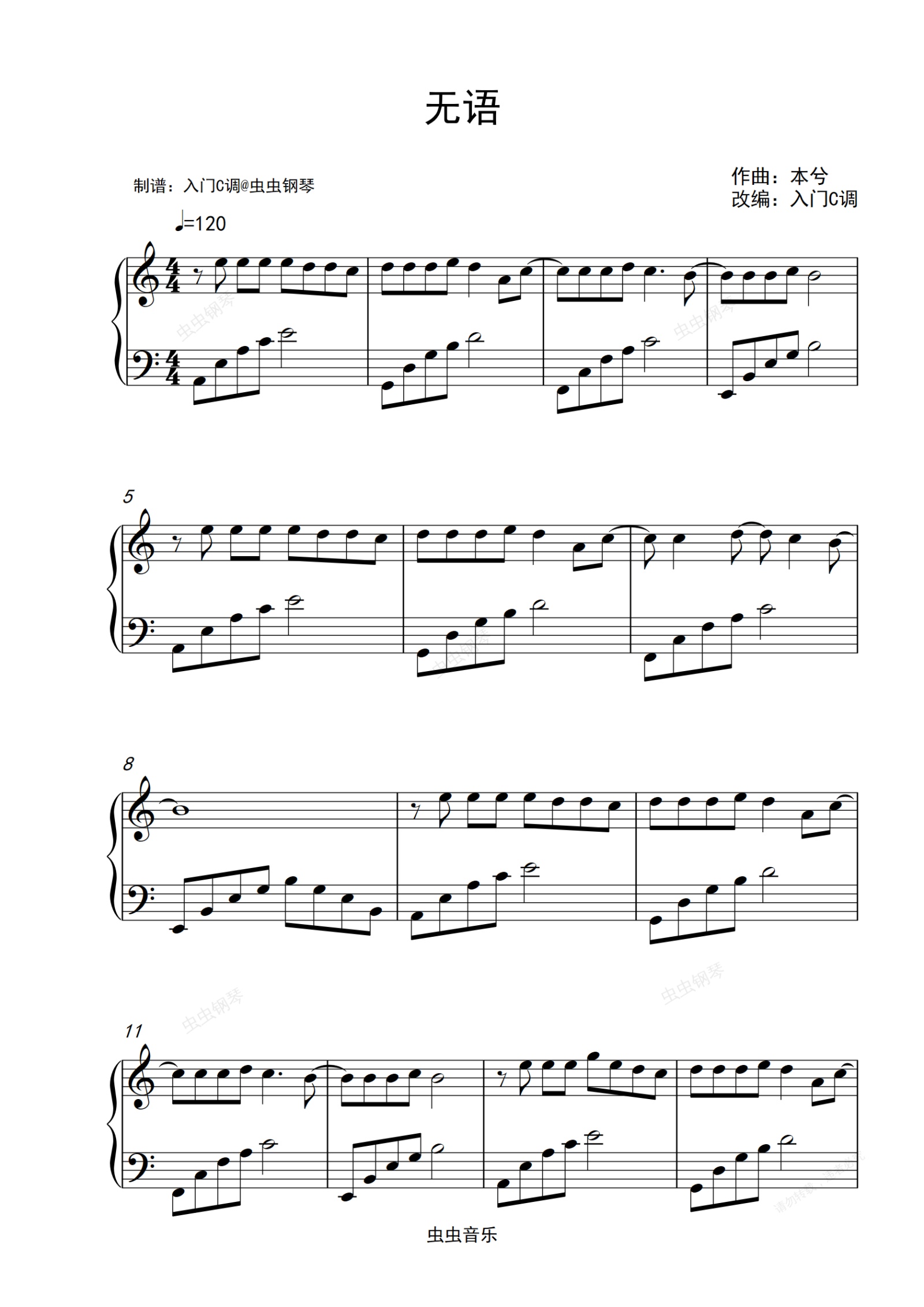 钢琴谱:本兮《无语》入门C调简单抒情版