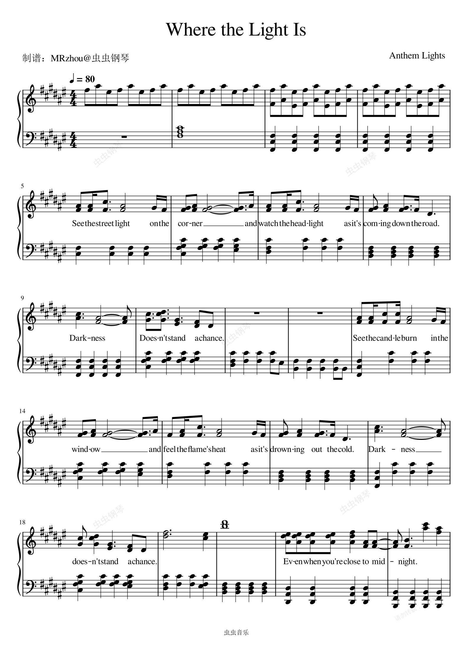 钢琴谱:Where The Light Is - Anthem Lights (国歌灯)