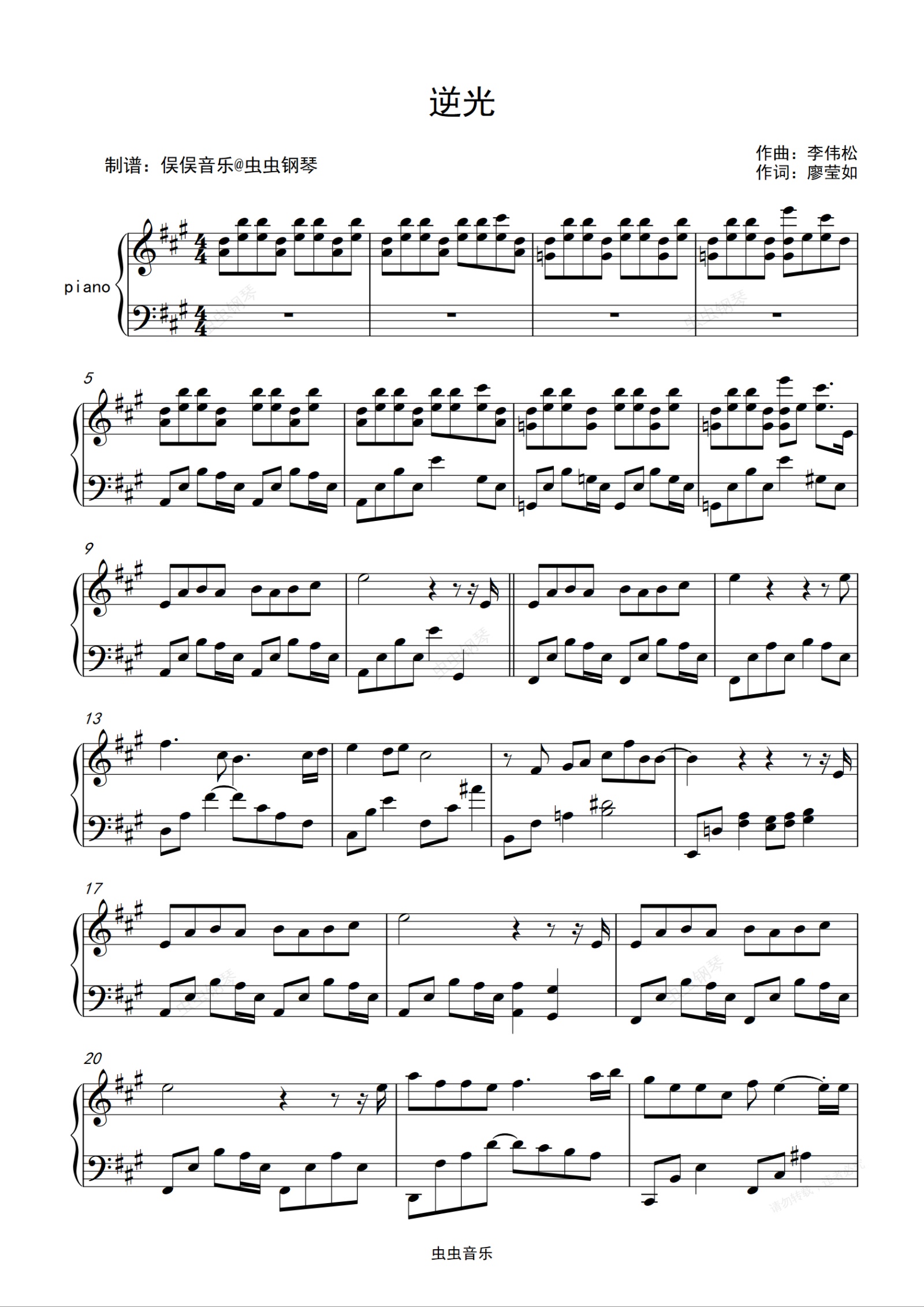 钢琴谱:孙燕姿-逆光(A调完美复刻版)