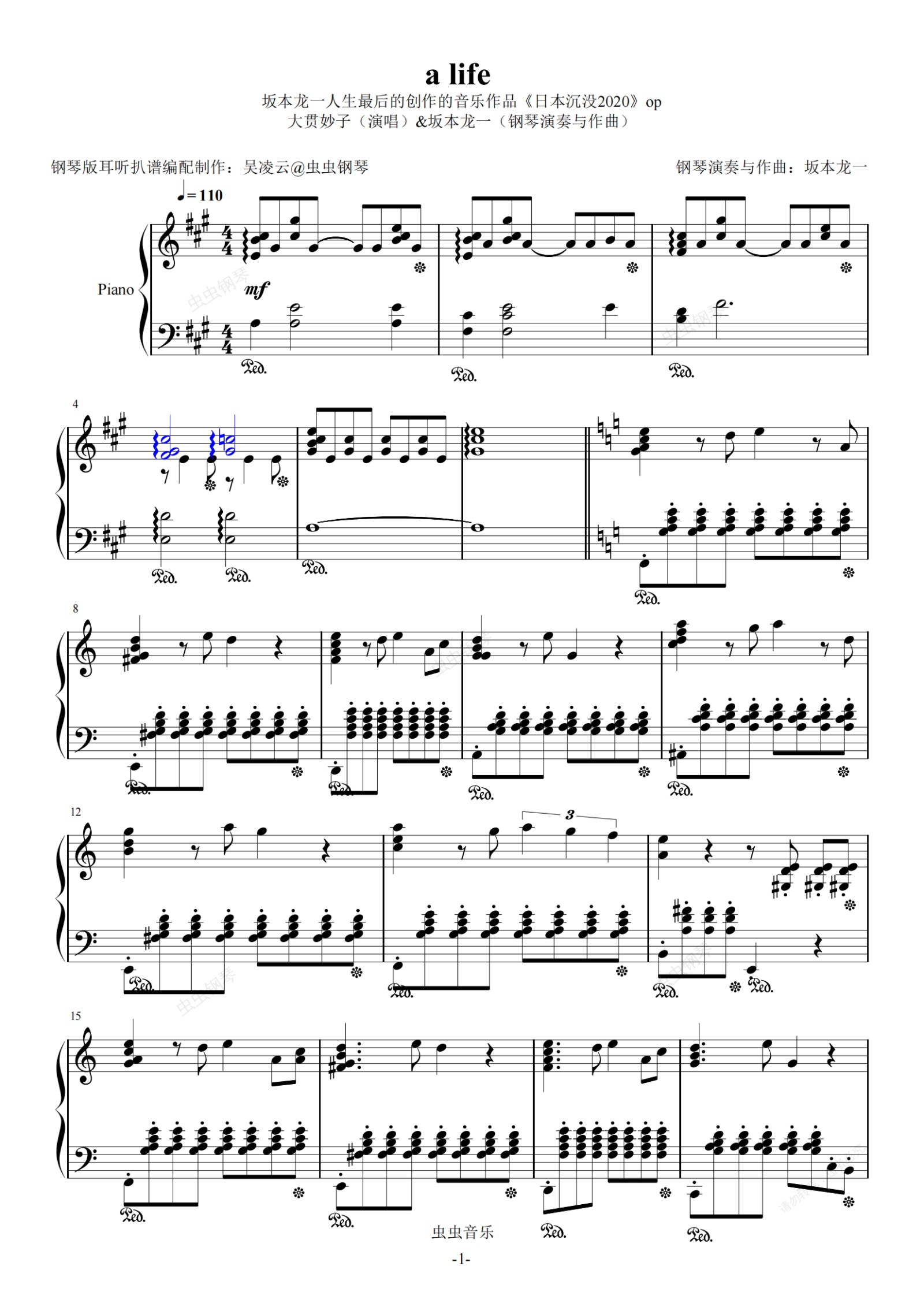 钢琴谱:a life 坂本龙一人生最后的创作的音乐作品《日本沉没2020》op 大贯妙子&坂本龙一