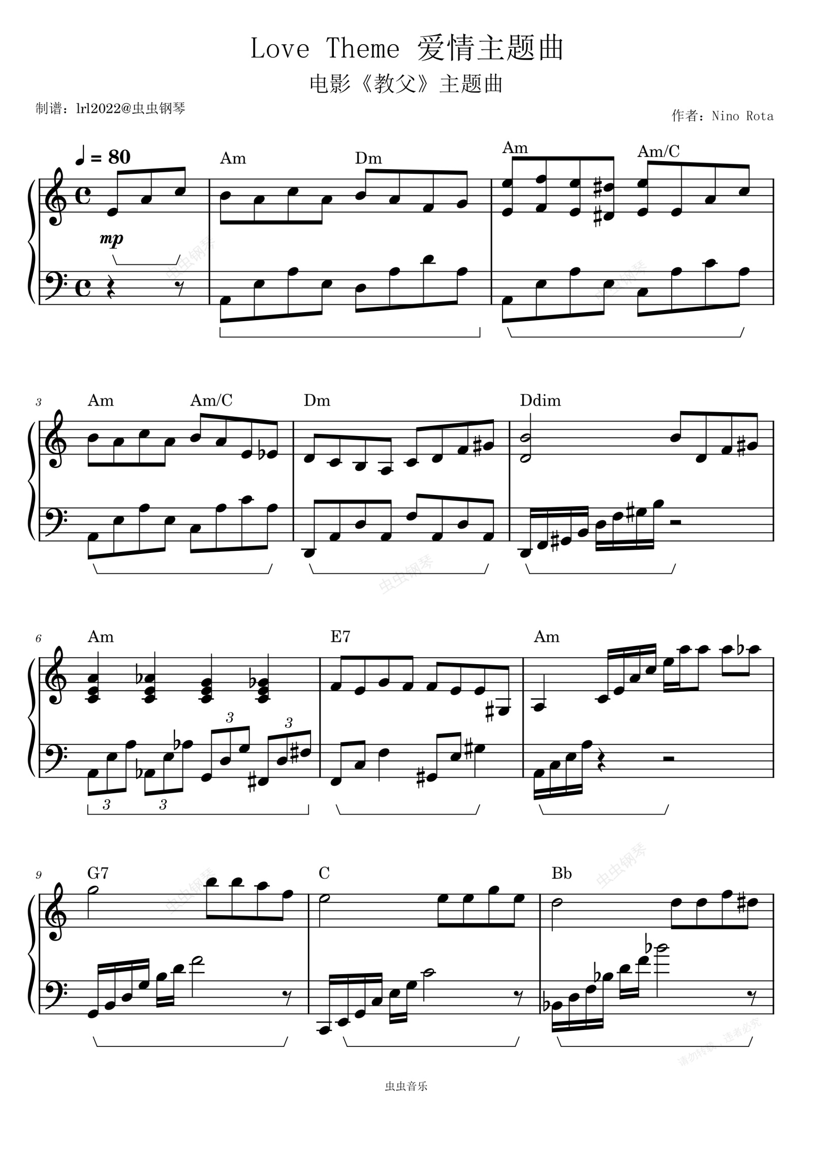 钢琴谱:Love Theme - 电影《教父》主题曲 - 钢琴独奏 - 带和弦标记