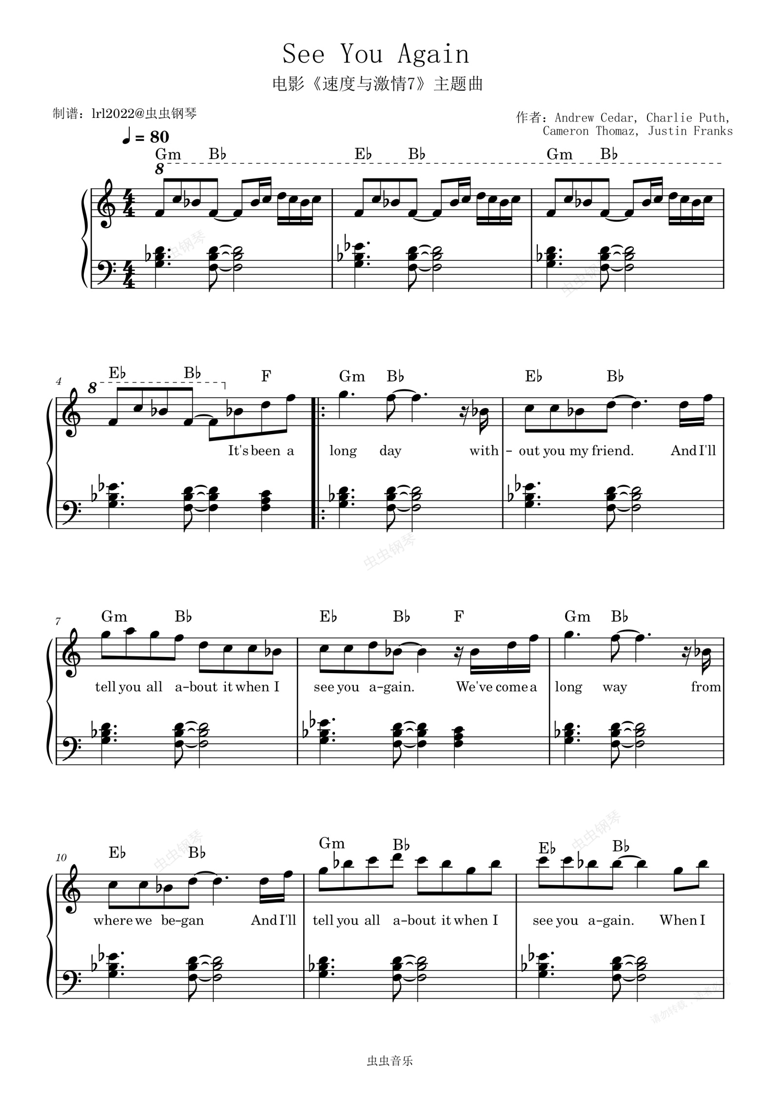 钢琴谱:See You Again -《与你重逢之时》- 电影《速度与激情7》主题曲 - 钢琴独奏 - 带歌词和弦