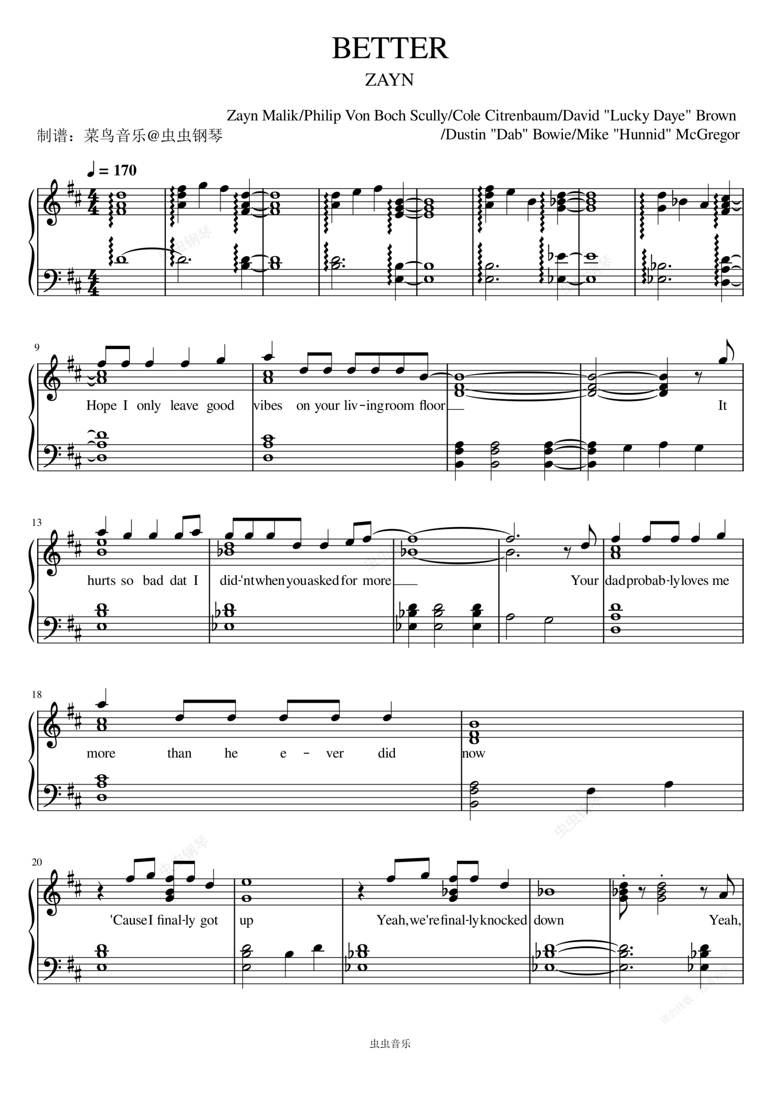 钢琴谱:Better - ZAYN (泽恩)
