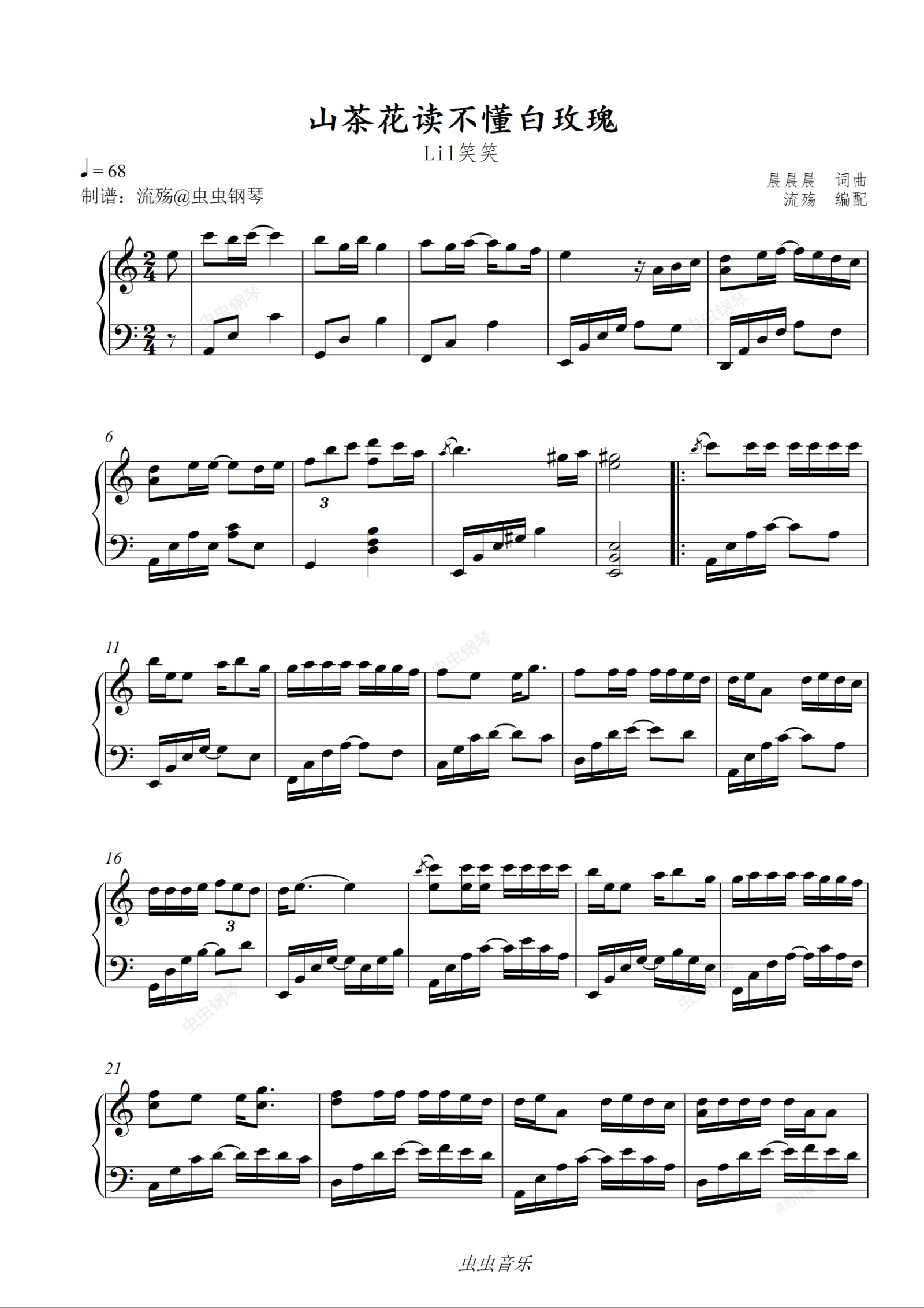 钢琴谱:山茶花读不懂白玫瑰(C调版)