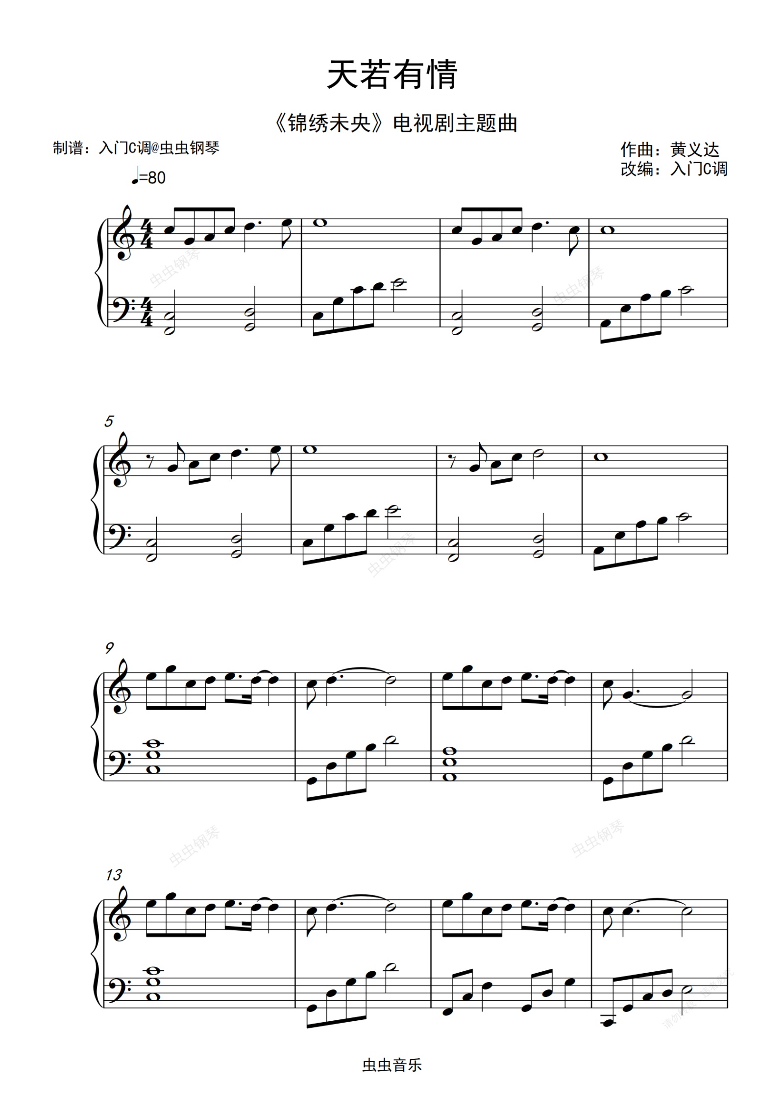 钢琴谱:A-Lin《天若有情》(《锦绣未央》主题曲)入门C调抒情版