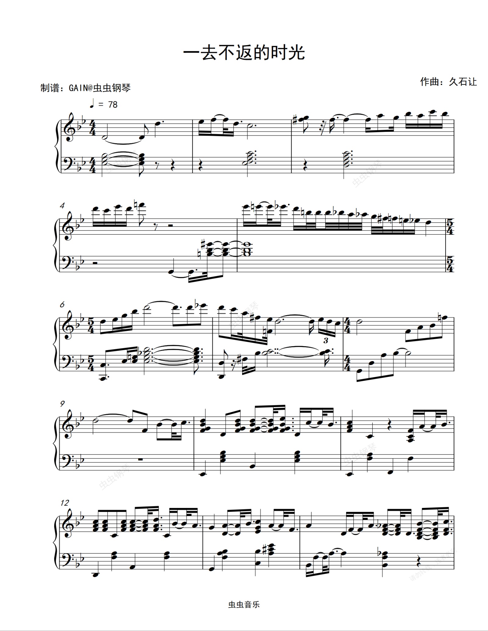 钢琴谱:一去不返的时光-帰らざる日々-久石让