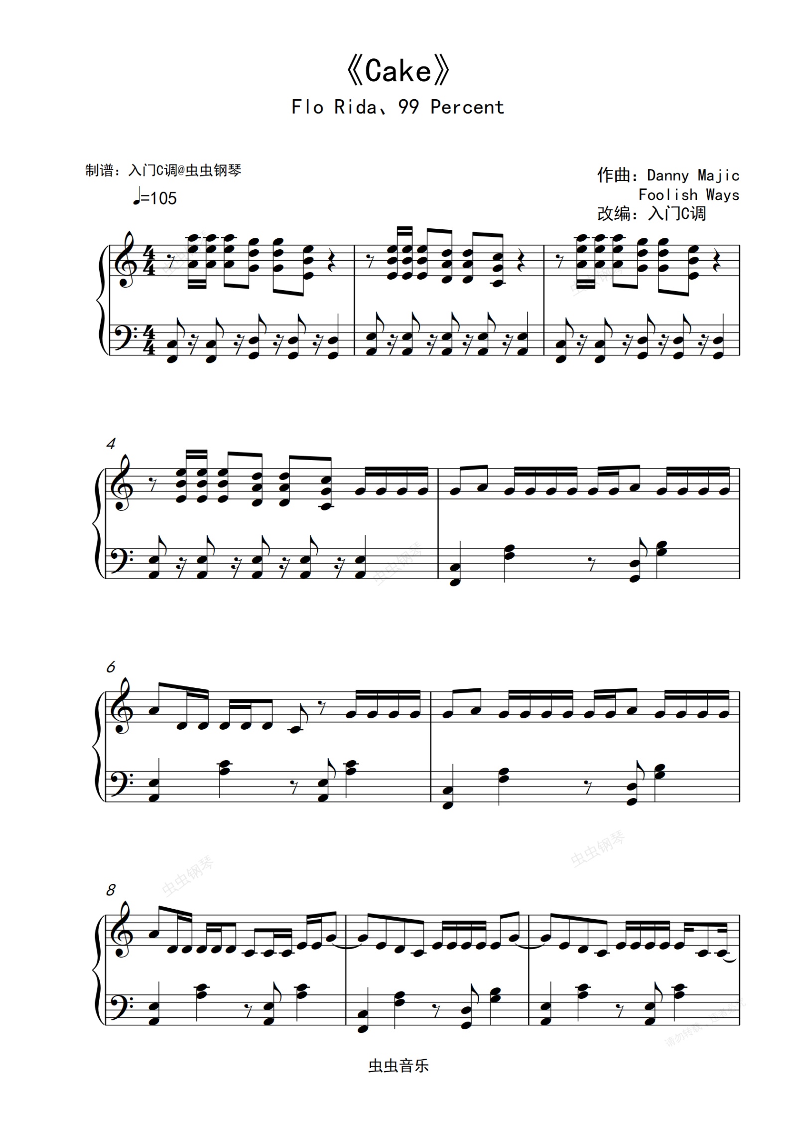 钢琴谱:Flo Rida、99 Percent 《Cake》入门C调简单版