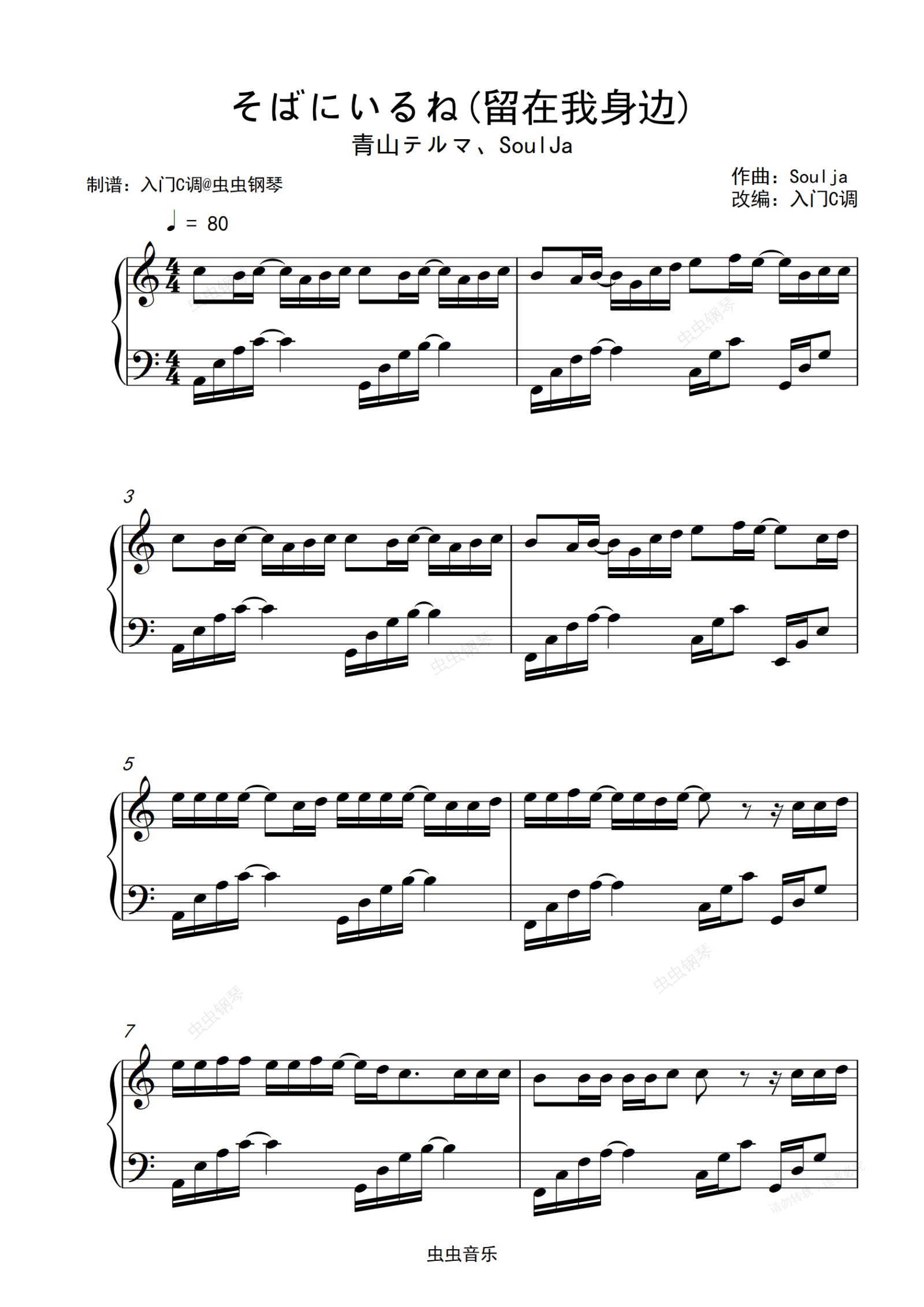钢琴谱:青山テルマ、SoulJa《そばにいるね(留在我身边) 》入门C调抒情版