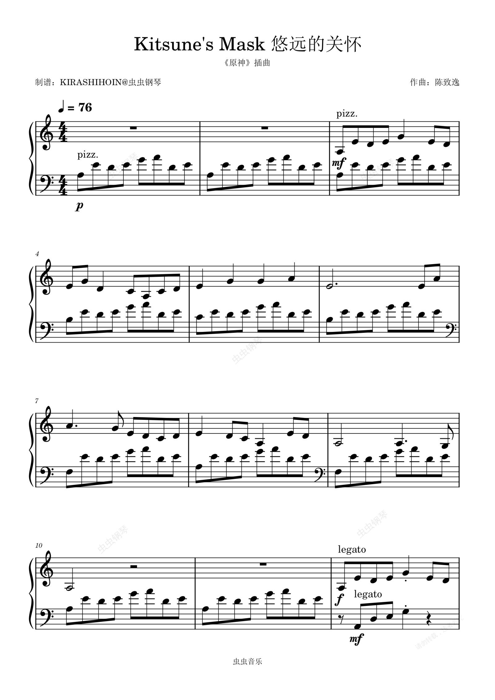 钢琴谱:Kitsune's Mask 悠远的关怀(《原神》插曲)- 陈致逸