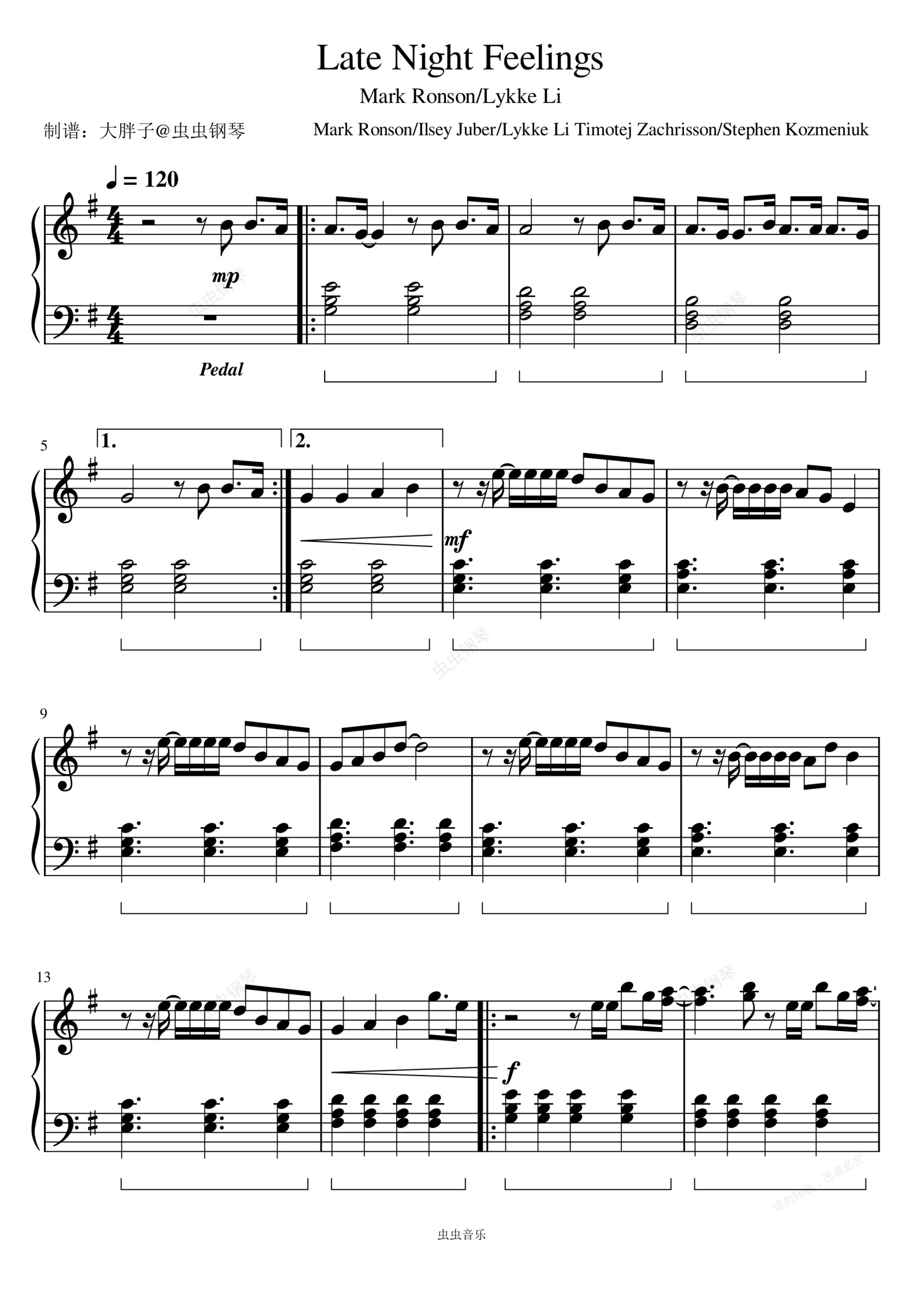 钢琴谱:Late Night Feelings - Mark Ronson/Lykke Li