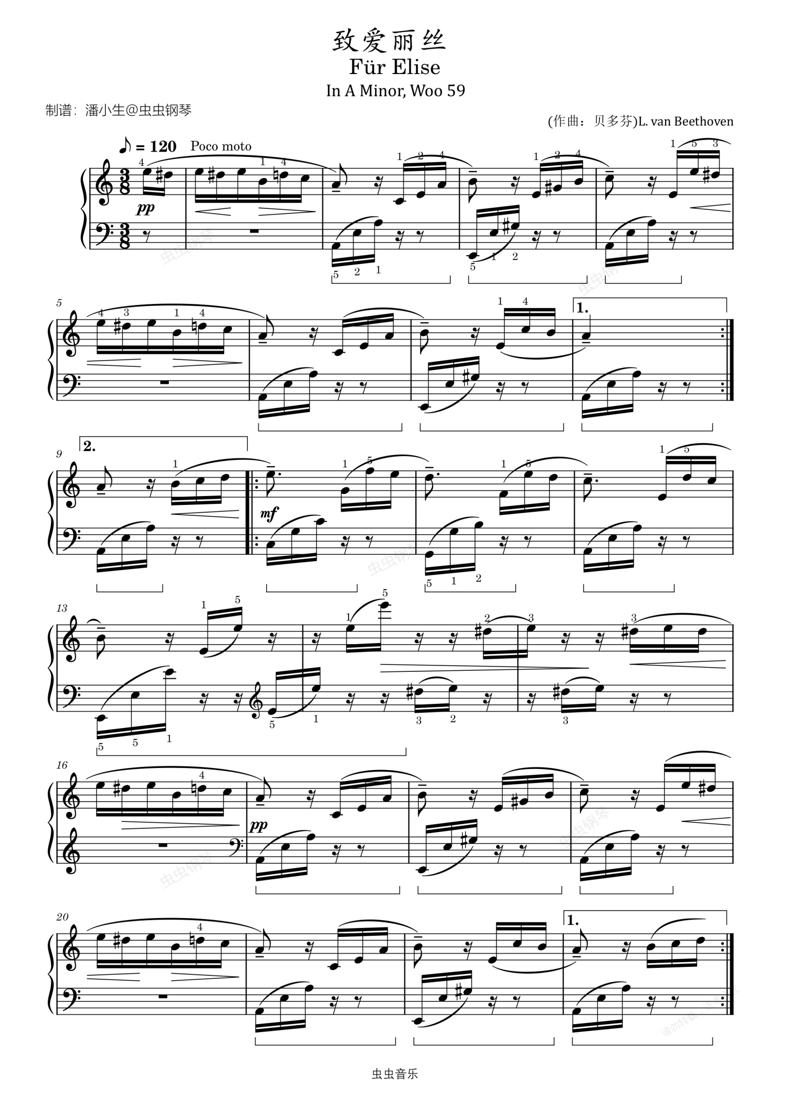 钢琴谱:Fur Elise 致爱丽丝 原版重制 带指法 贝多芬 Woo 59 Beethoven