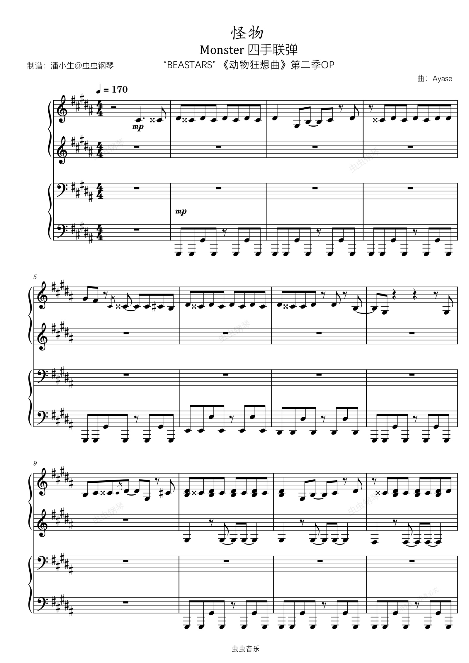 钢琴谱:Monster  怪物 四手联弹 《动物狂想曲》第二季OP  “BEASTARS”