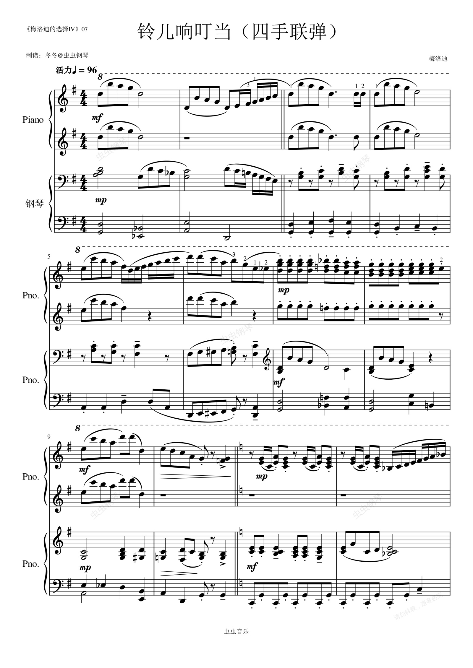 钢琴谱:铃儿响叮当(四手联弹)