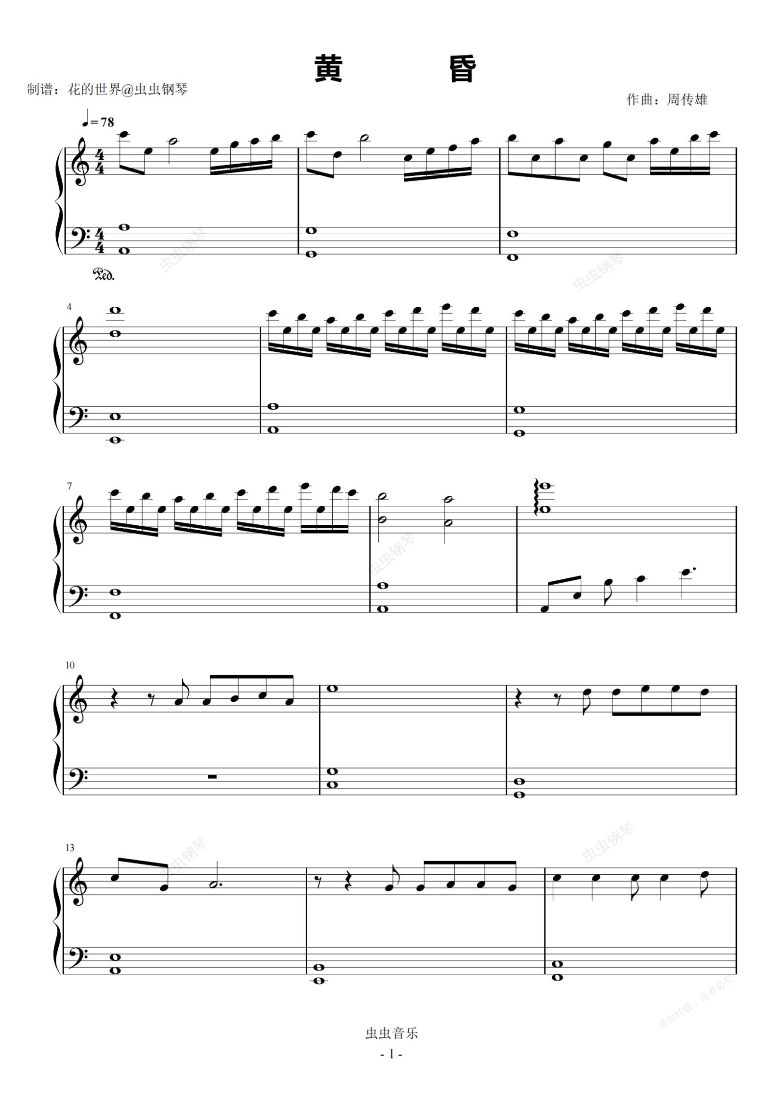 钢琴谱:黄昏 C调简易版 周传雄