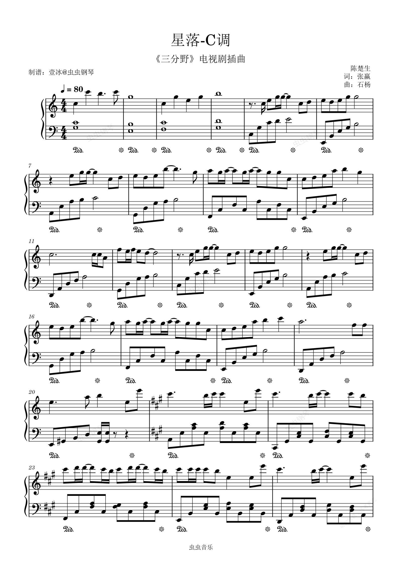 钢琴谱:【影视配乐】星落 (《三分野》电视剧插曲) 简单易上手-原调