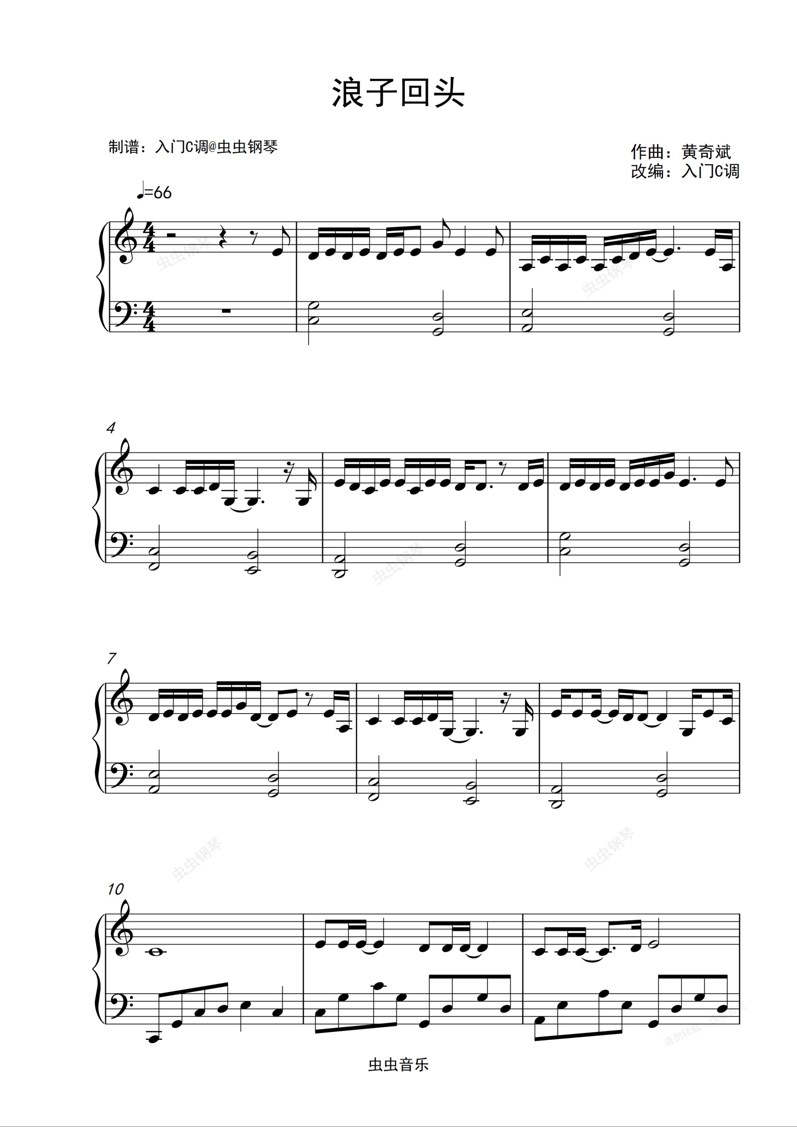 钢琴谱:茄子蛋《浪子回头》入门C调简单版
