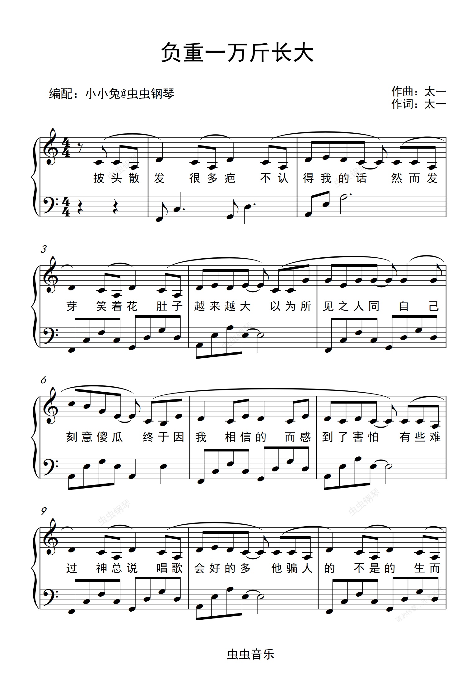 钢琴谱:负重一万斤长大 C调