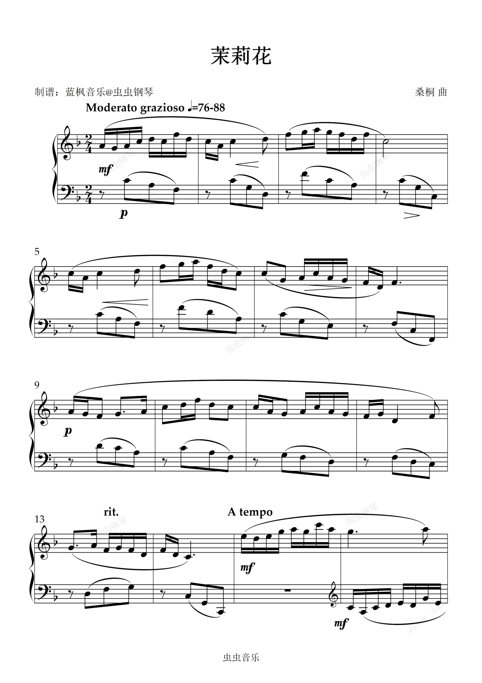 《茉莉花》是一首家喻户晓的民歌,在国际上广为流传,它起源于南京六合民间传唱百年的《鲜花调》。此曲是由我国著名的音乐教育家、作曲家、音乐理论家桑桐(1923-2011)改编创作的钢琴独奏版本,2023年是桑桐先生诞辰100周年。该曲旋律柔婉流畅,感情细腻真挚,具有恬静的江南风味和浓郁的民歌风格。演奏时应使用柔和的触键展现旋律的歌唱性,并注意节奏的准确性,理清乐句。整曲分为三段,其中第二段为二重唱,注意加强左右手的配合度和协调性。