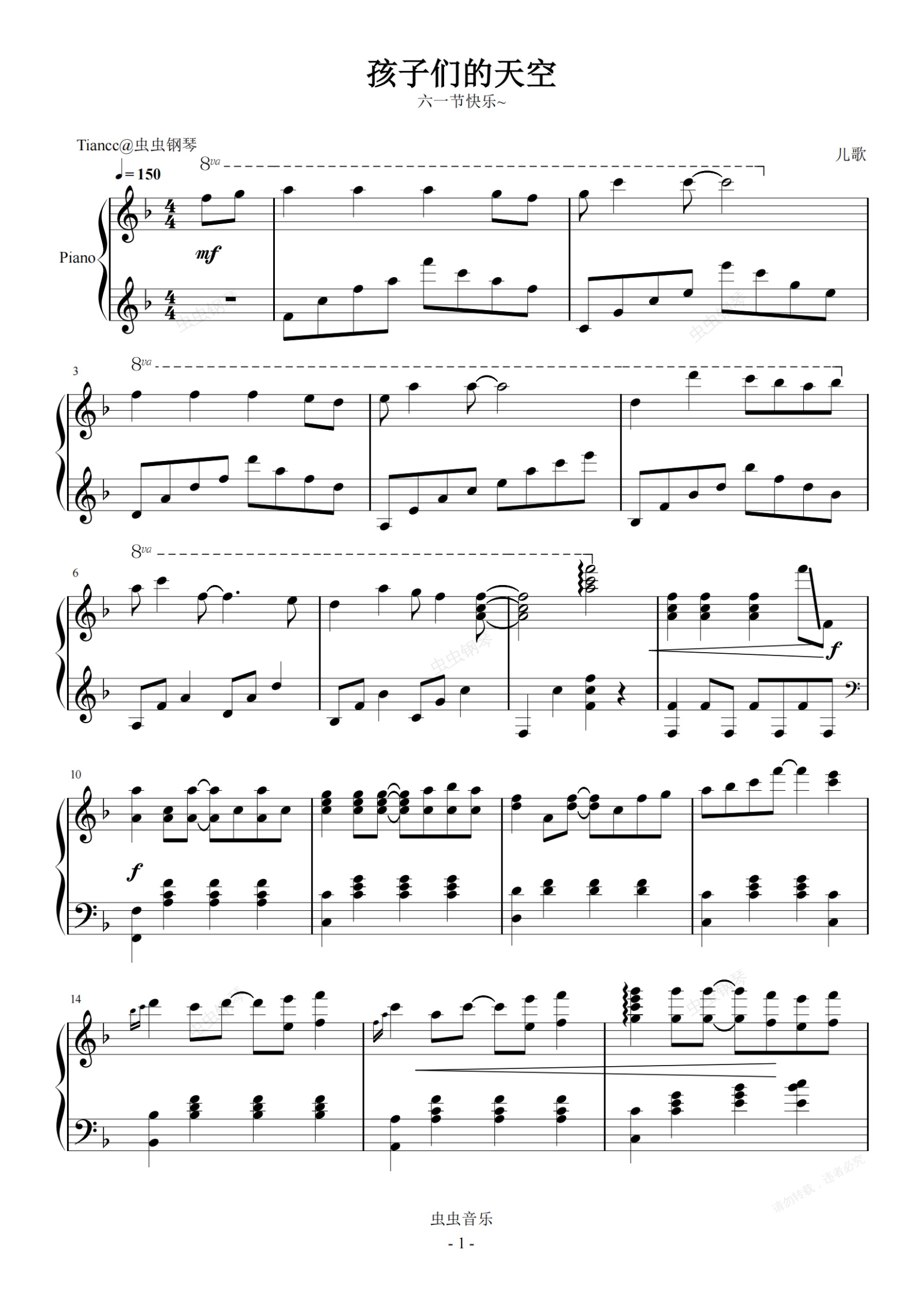 钢琴谱:《孩子们的天空》小朋友们六一节快乐~