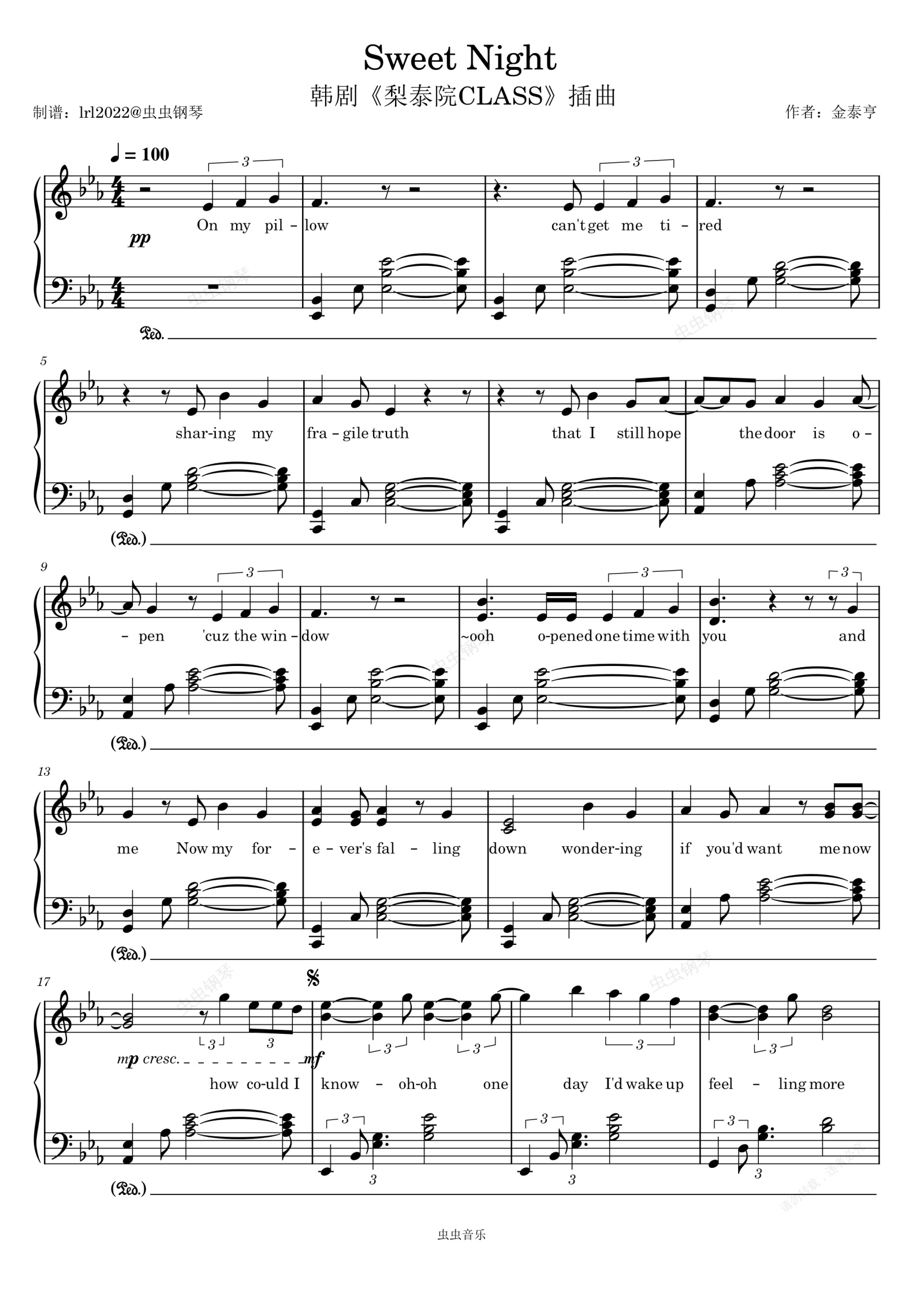 钢琴谱:Sweet Night - 韩剧《梨泰院CLASS》插曲 - 钢琴伴奏+歌词 - BTS