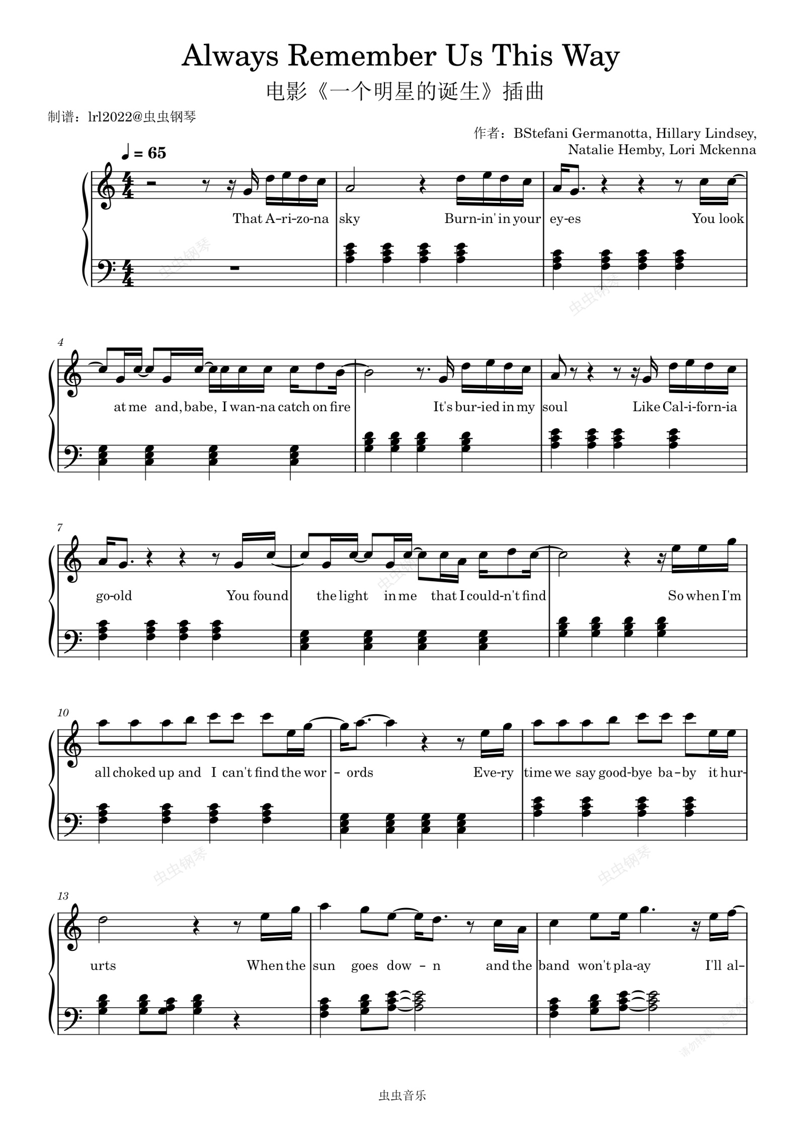 钢琴谱:Always Remember Us This Way - 电影《一个明星的诞生》插曲 - 独奏加歌词