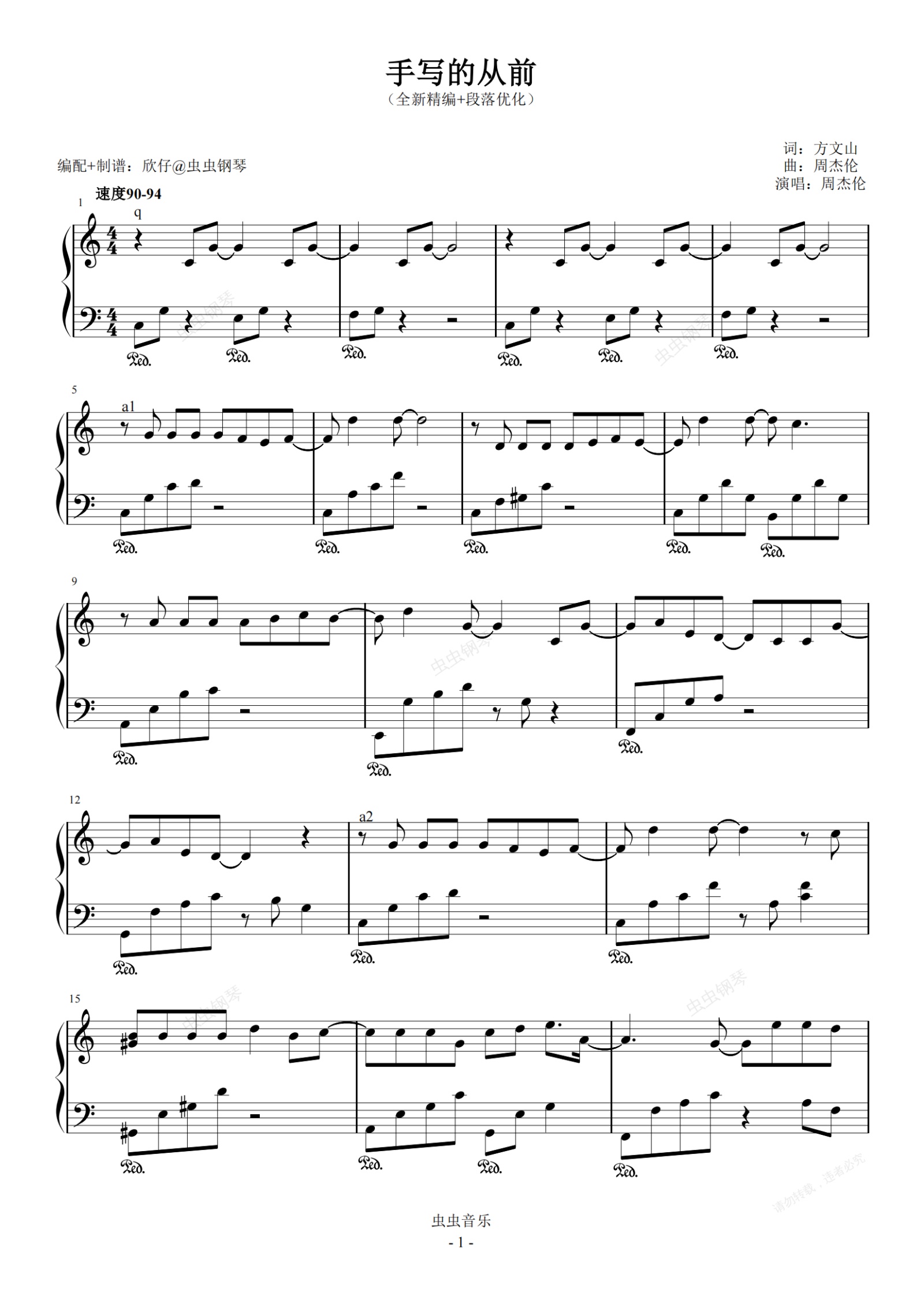 钢琴谱:周杰伦-C《手写的从前》(全新精编+段落优化)