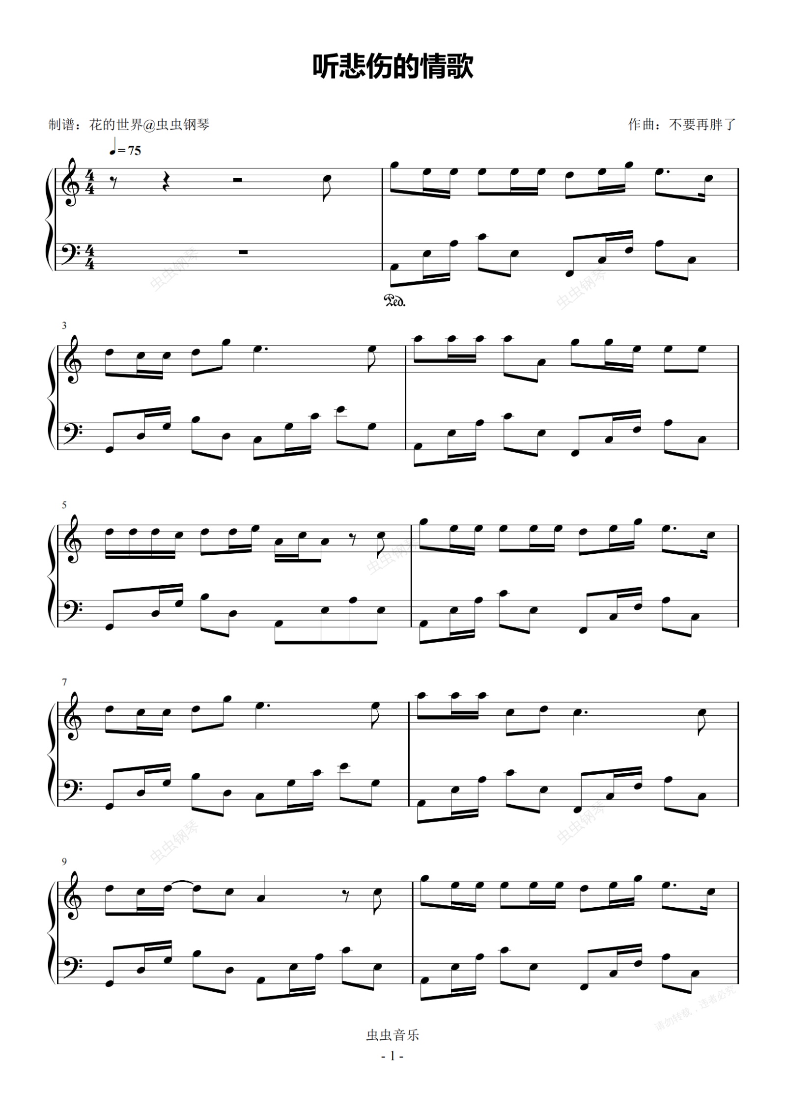 钢琴谱:听悲伤的情歌 C调简易版 苏星婕