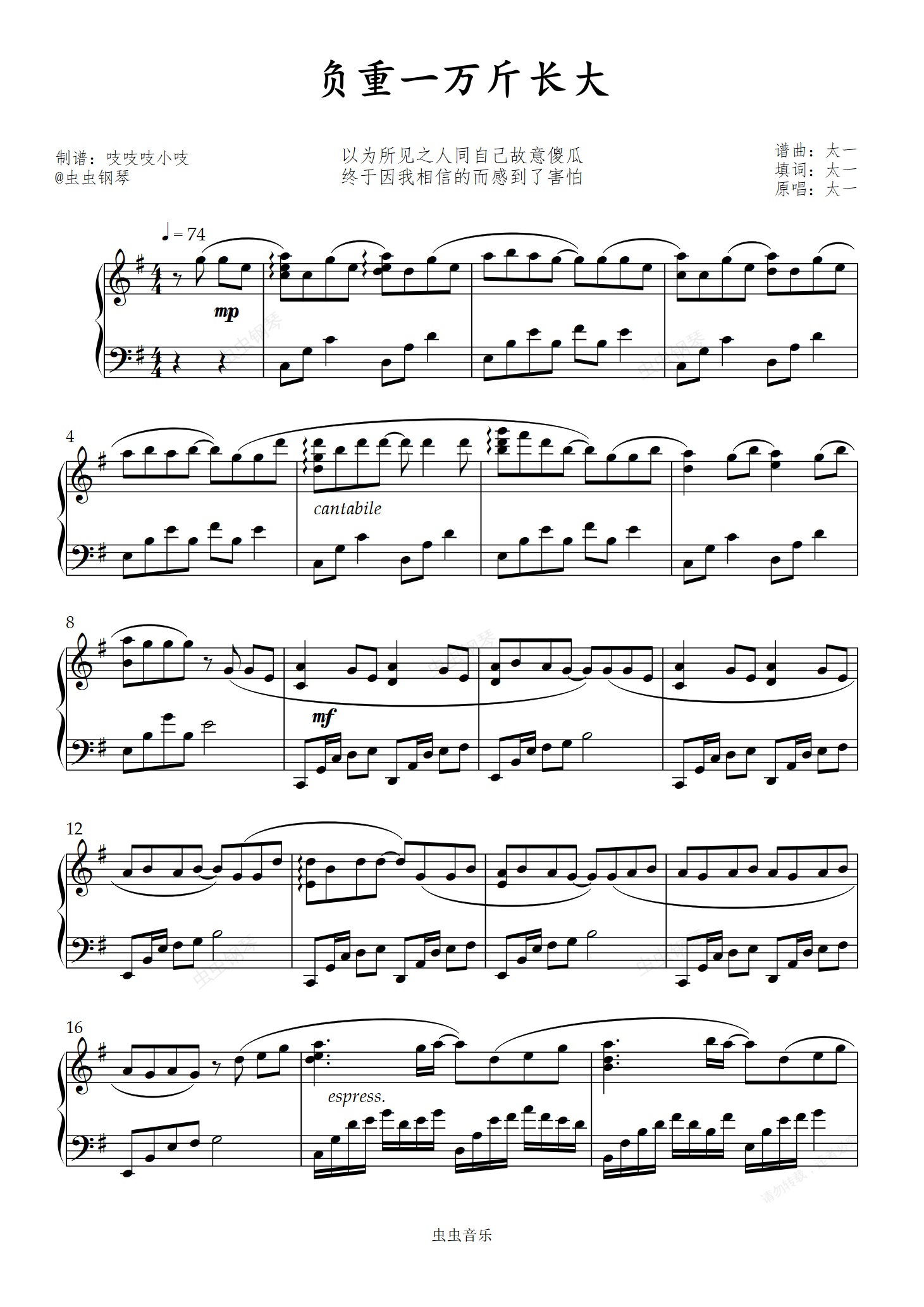 钢琴谱:负重一万斤长大(救赎版)G调 太一