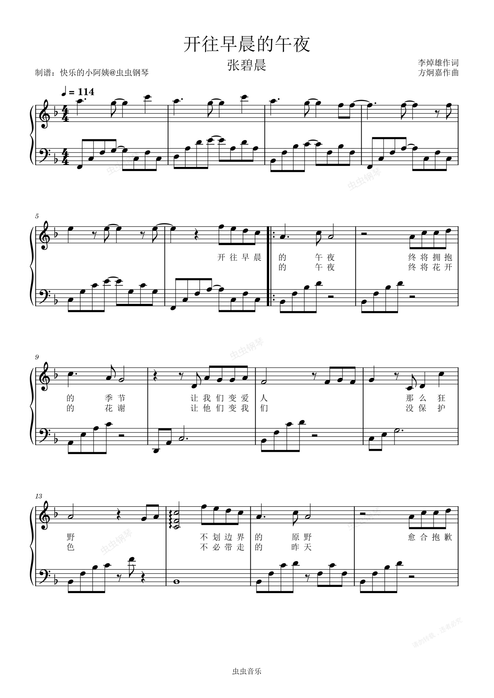 钢琴谱:开往早晨的午夜-张碧晨-原调带歌词