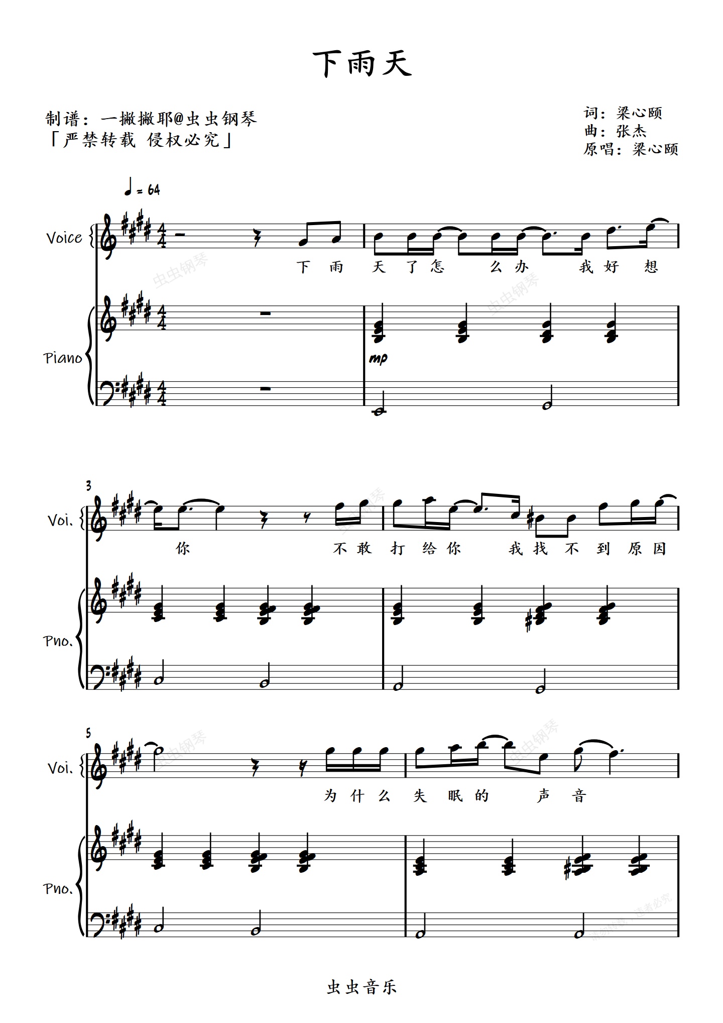 钢琴谱:原版弹唱《下雨天》南拳妈妈-梁心颐「一撇撇耶」